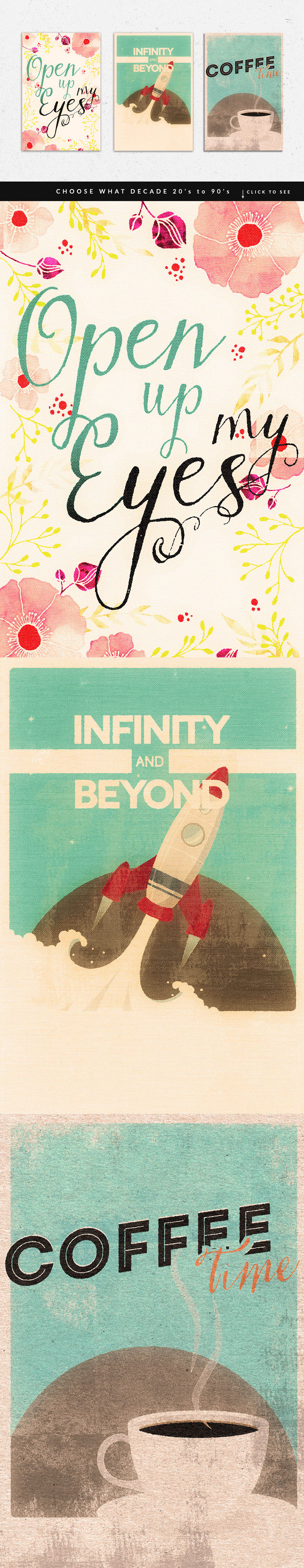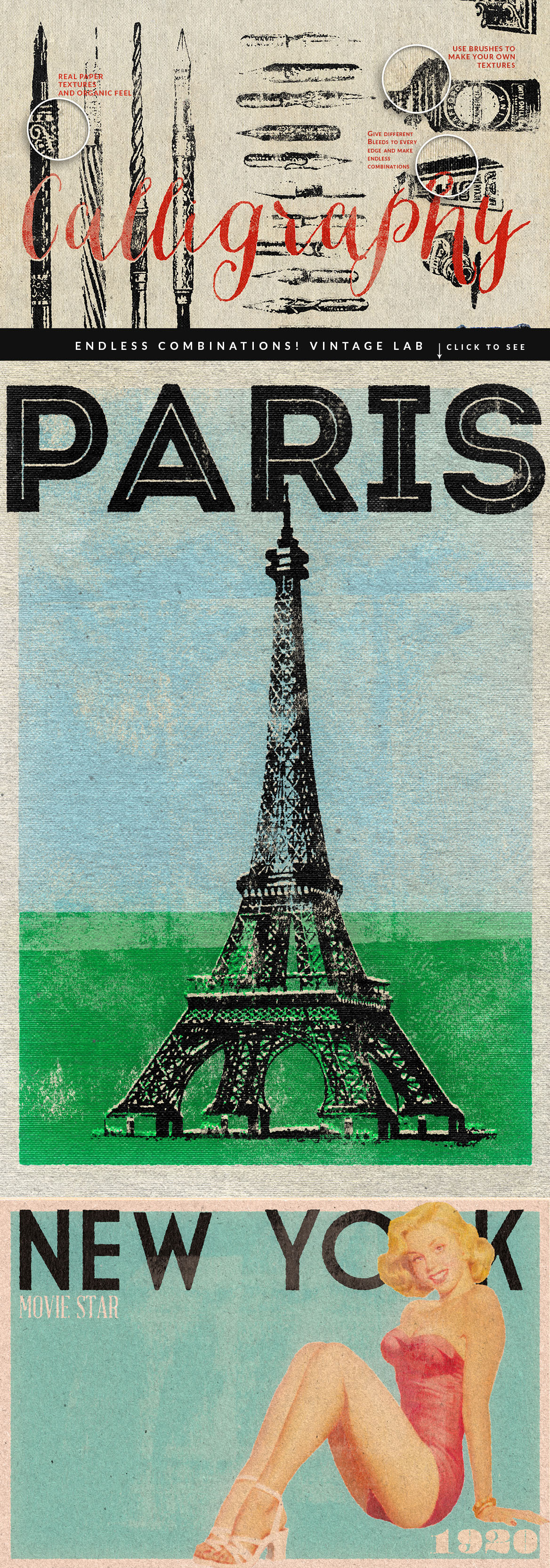 This kit is completely different than any other “texture or add-on” kit you’ve seen. First of all, with the brushes included you can start creating different textures and styles to fit the Decade you want your design to be in, just select the brush and apply it and that’s it. This is like a real Lab where you use different tools to create new things or get old vintage styles. Choose the decade and start creating. Vintage Lab recreates those wonderful works of art instantly from the 1920s to the 1990s. It adds unique and realistic textures, filters and even offsets the black from the colors, inconsistent edges, old gradients and some ink spilled. This is done automatically all inside the Vintage Lab PSD. Just one place to paste your work and it’s done. Requirements: Photoshop CS3 or above. Will NOT work in PS Elements or Coral Draw.