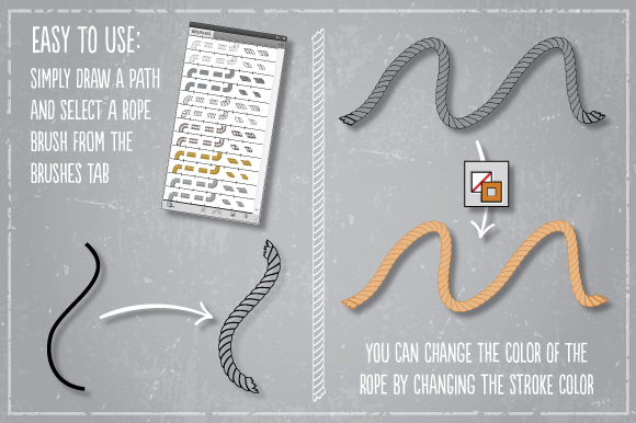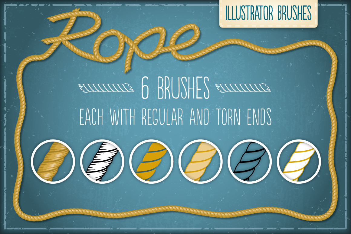 These six Illustrator Rope brushes will make a great addition to your design arsenal! Each brush comes in two versions: regular and torn ended. Inside and outside corner tiles are also included. Compatible with Illustrator CS1+. Instructions provided.