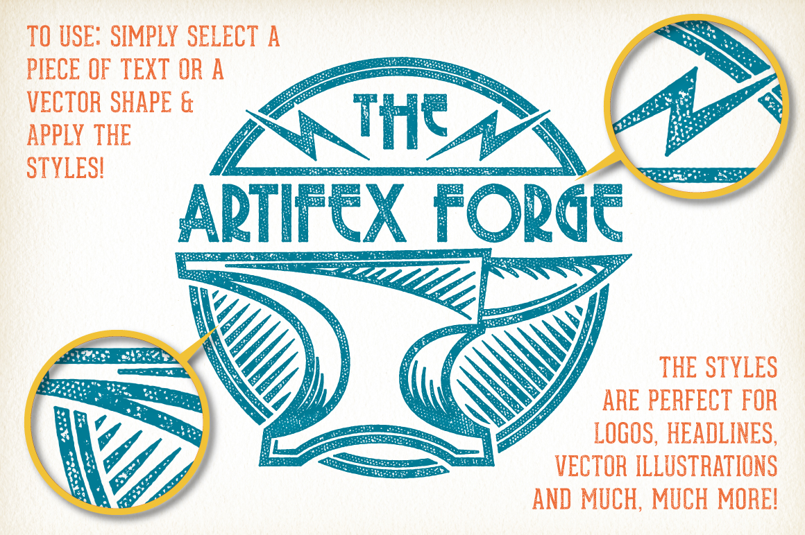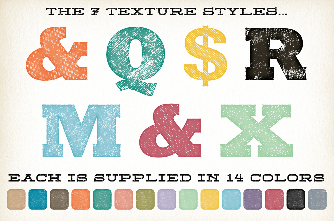 Make your customers believe that your designs have come straight off the press with these realistic, vintage print layer styles! Layer styles allow you to quickly change the look of text and objects with just one click! Because these are in vector format they can be enlarged almost infinitely without loss of resolution. The pack contains seven different textured styles – each in 15 colors. Easy to use – instructions included.