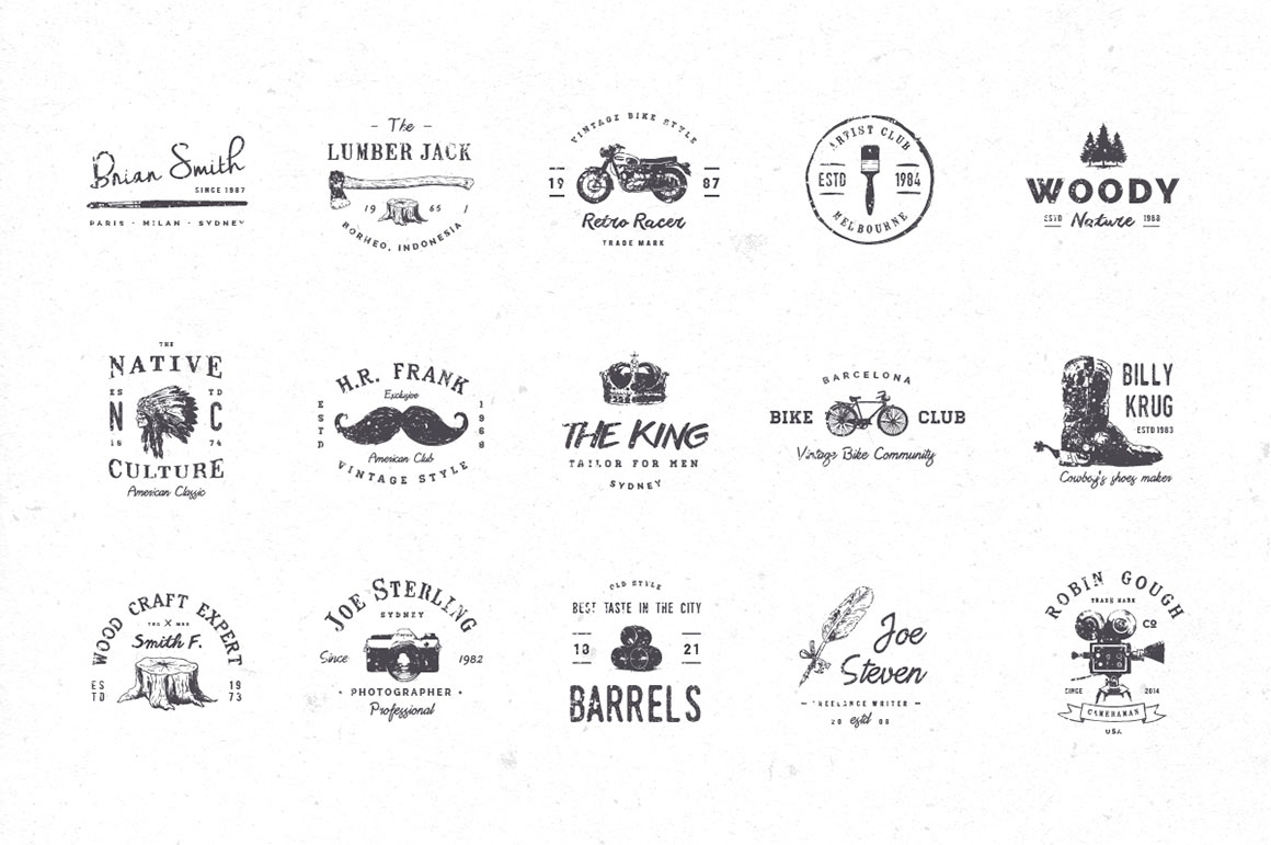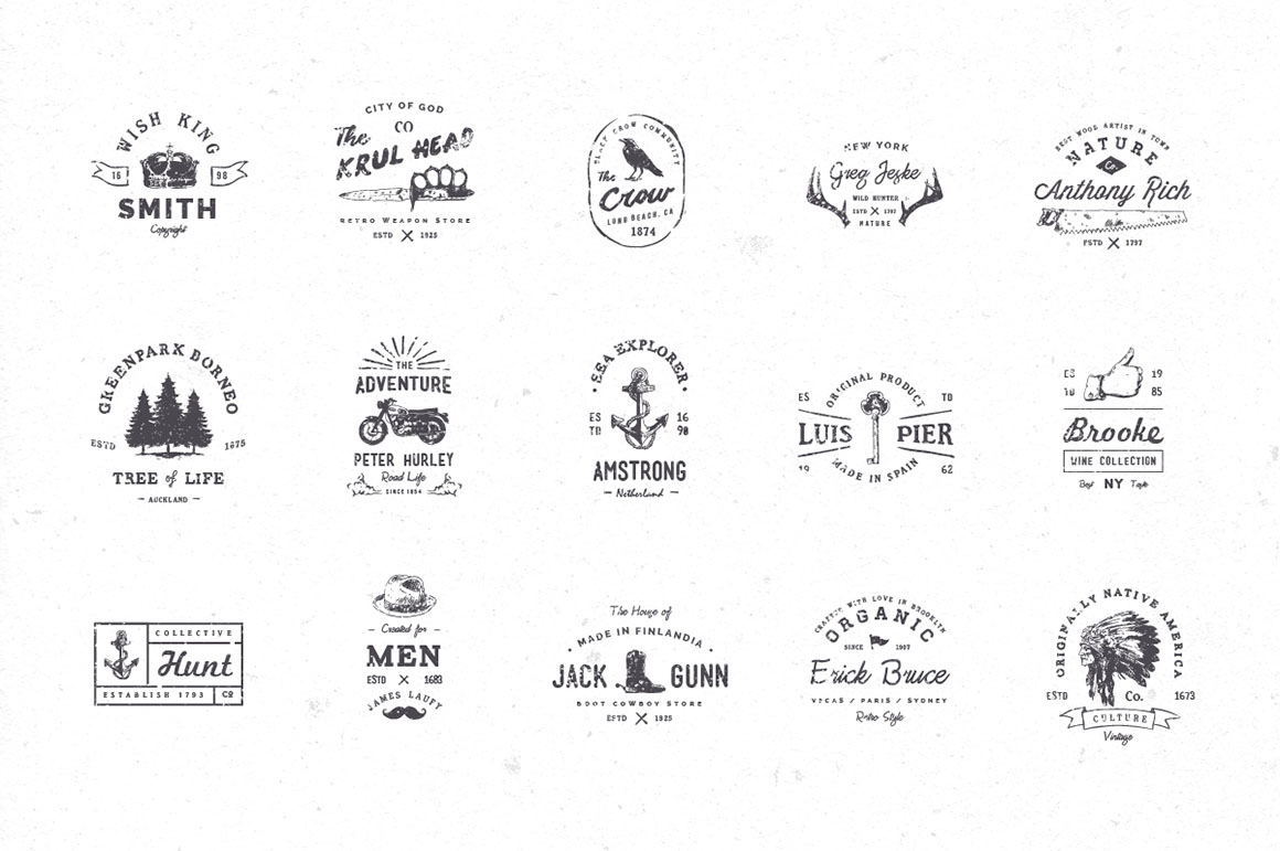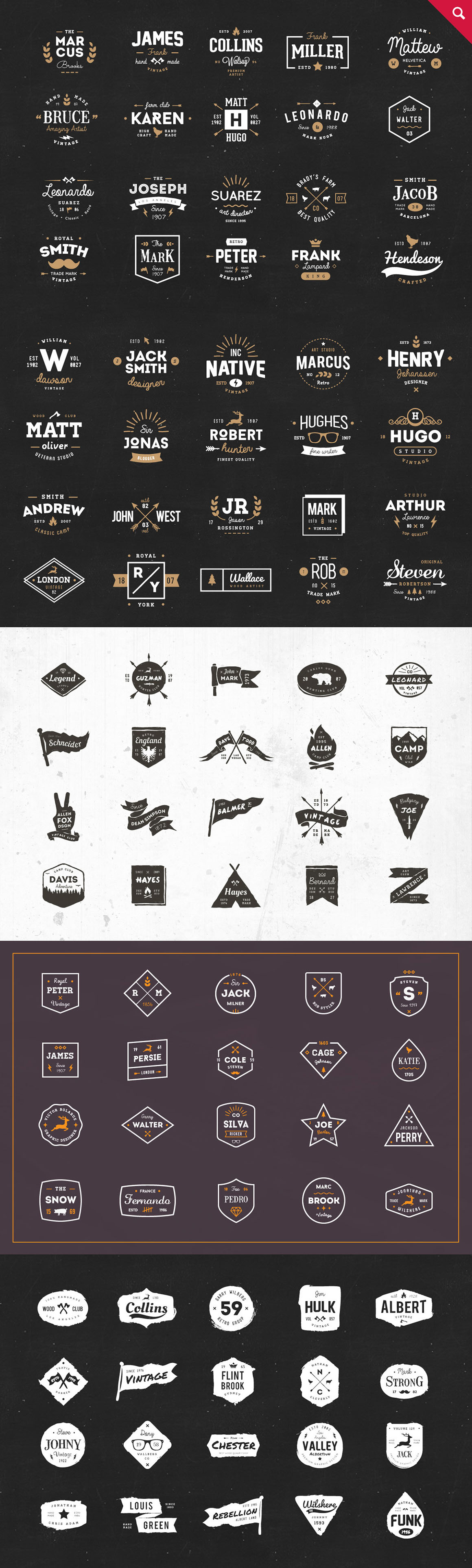 BIG BUNDLE!! The huge bundle of Vintage Logotype and Insignia is here!! All logos are editable, 100% free fonts and you can resized or scaled down to any size, without loss of quality. You can easily edit in Illustrator or Photoshop. PRODUCT DESCRIPTION: Vector format, Fully editable, Only free fonts used, Help file with download link for fonts, Organized layers, Available in AI + EPS + PSD, All are vector format and resizable.