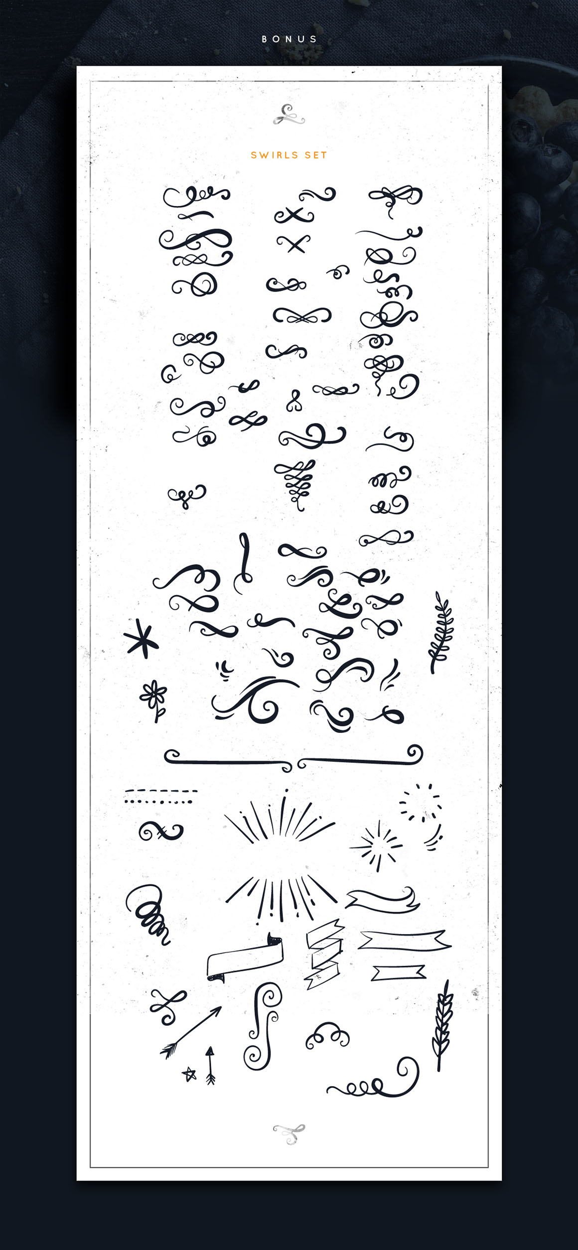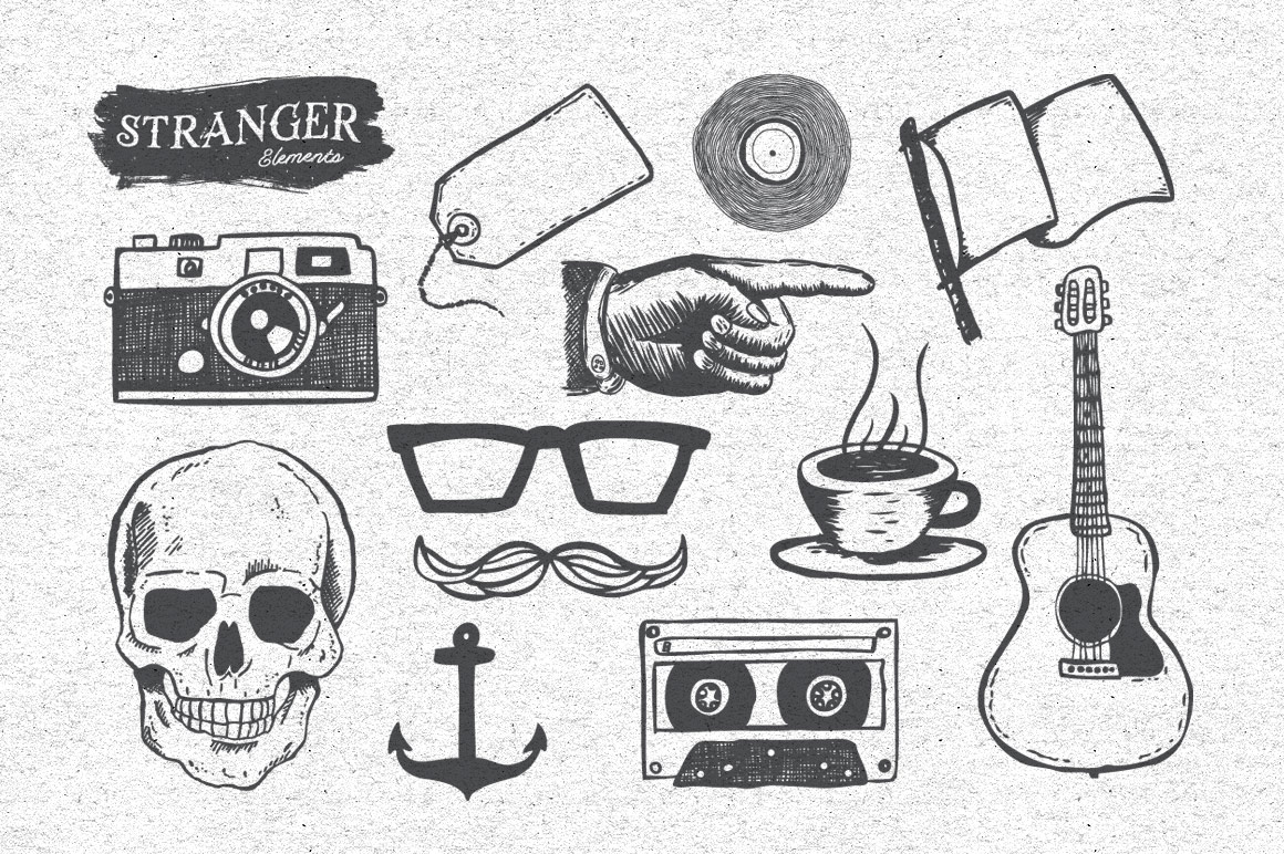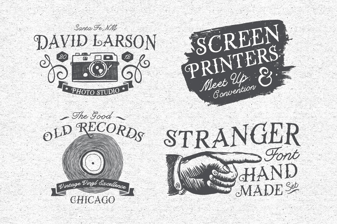 Introducing The Stranger Font Pack! This pack features two hand drawn font faces, plus an incredible collection of vector goodies. This set contains everything you need to complete a really nice hand made design. Here’s the break down on what’s inside: 1). Stranger – This is the main font in the collection. It contains two sets of uppercase letters, numbers and various symbols and punctuation. 2). Feathered is the secondary font that compliments the main font. This is a hand drawn script font that contains both upper and lowercase letters. 3). 18 Vector banners and badges. This is a handy set for creating labels and logos. The set features a hand drawn look with subtle grunge textures. 4). 12 Hand drawn vector illustrations. These illustrations were all created with pen and ink, then meticulously scanned and vectorized for your design pleasure. 5). 4 Pre-made label designs. These labels were designed using elements contained within this collection. The labels are fully editable in EPS format.