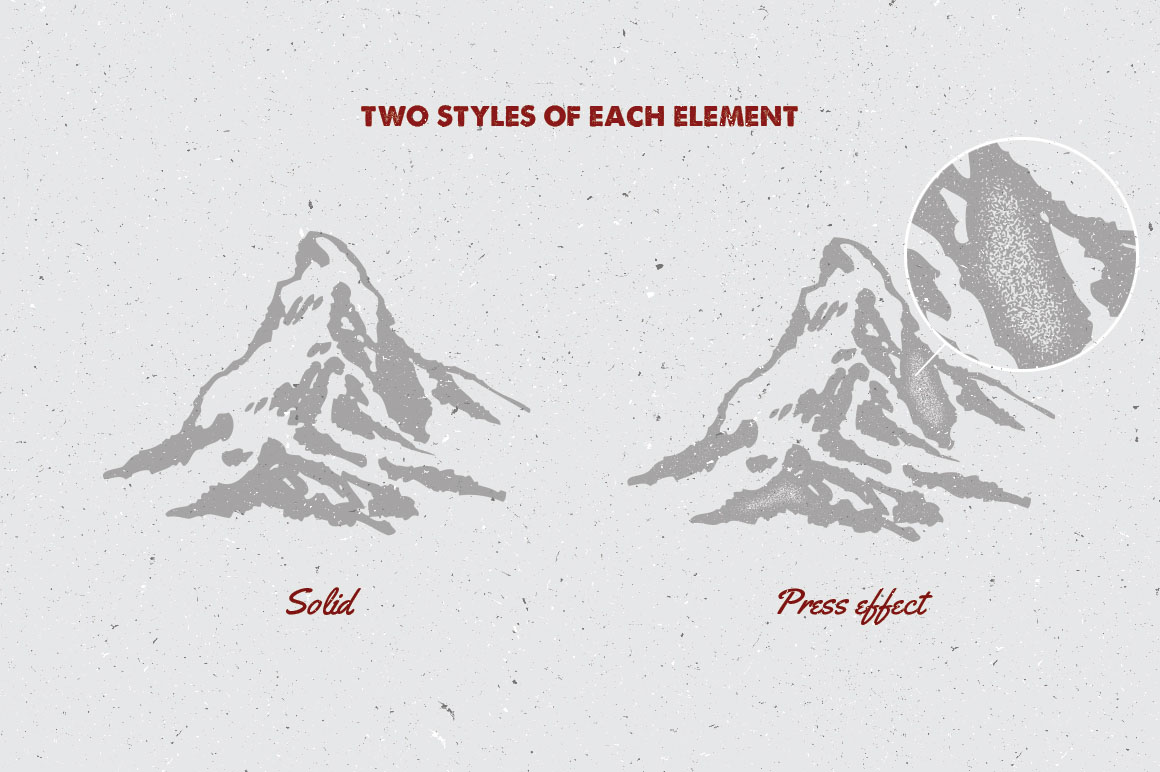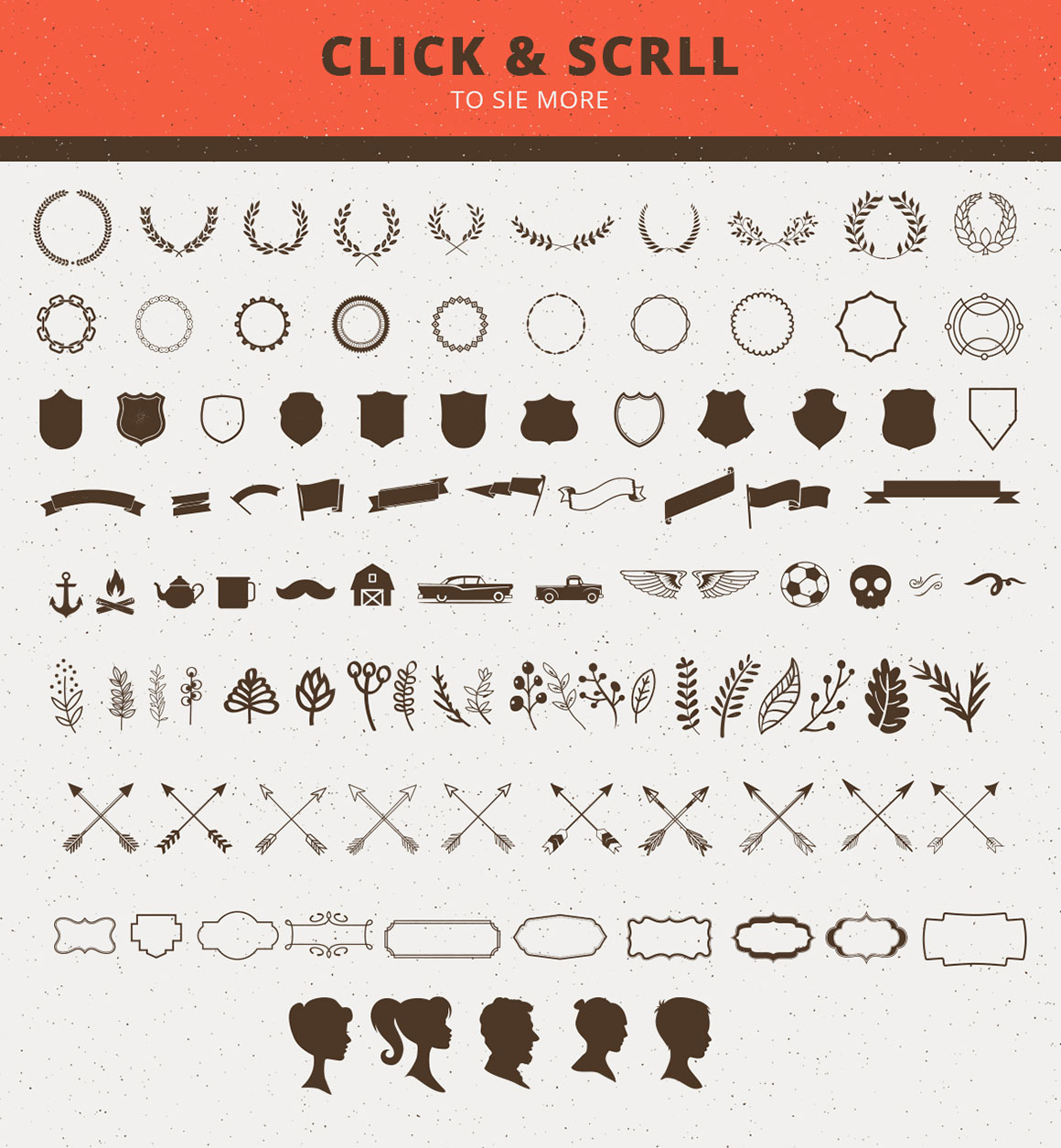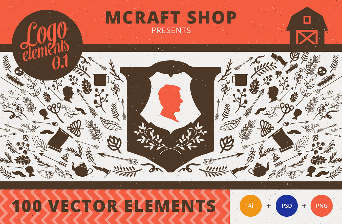 100 vector elements, each one is presented as vector .AI,Eps, PSD and hi-res .png. The elements include: laurels, badges, shields, banners, arrows, vegetation and other elements. Most of elements have great vintage texture applied to them, so you will get this cool antique & distressed look. With this set of elements it will be really easy for you to create vintage-looking premium quality logos. Just combine some elements of this pack and add some text and you have a super looking logo.