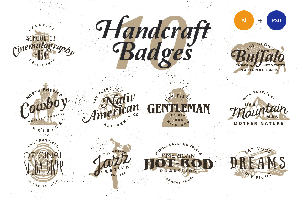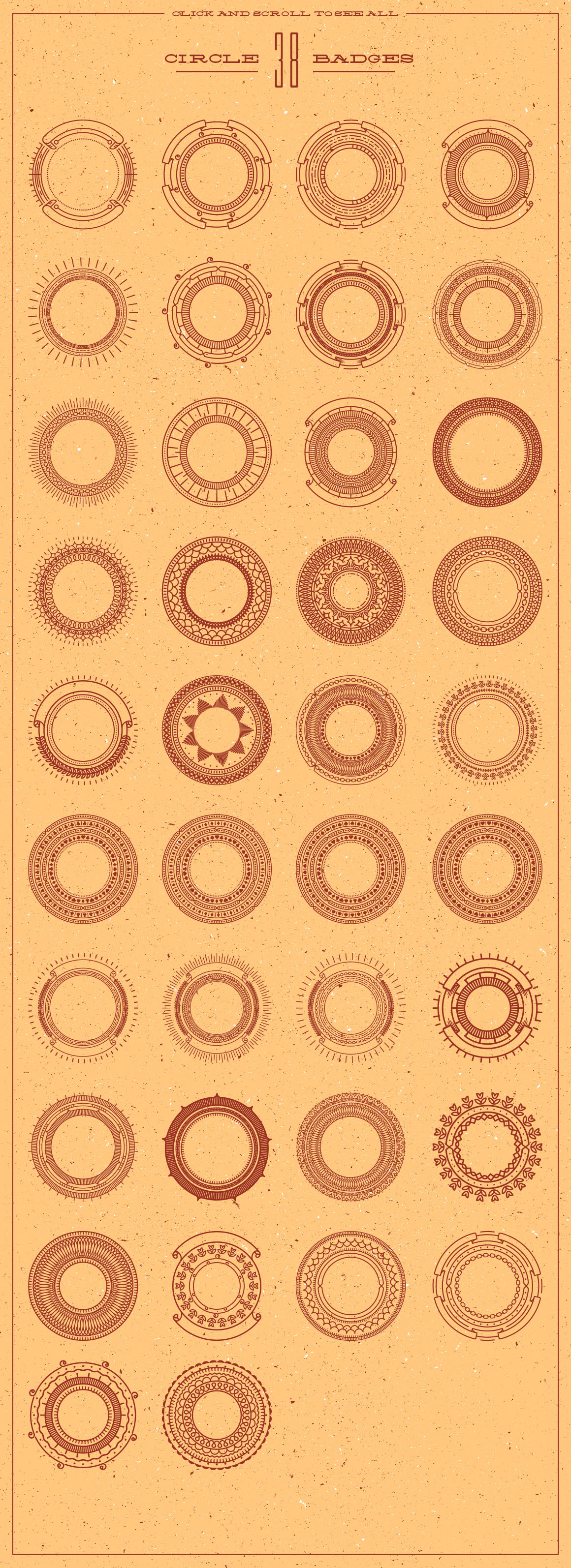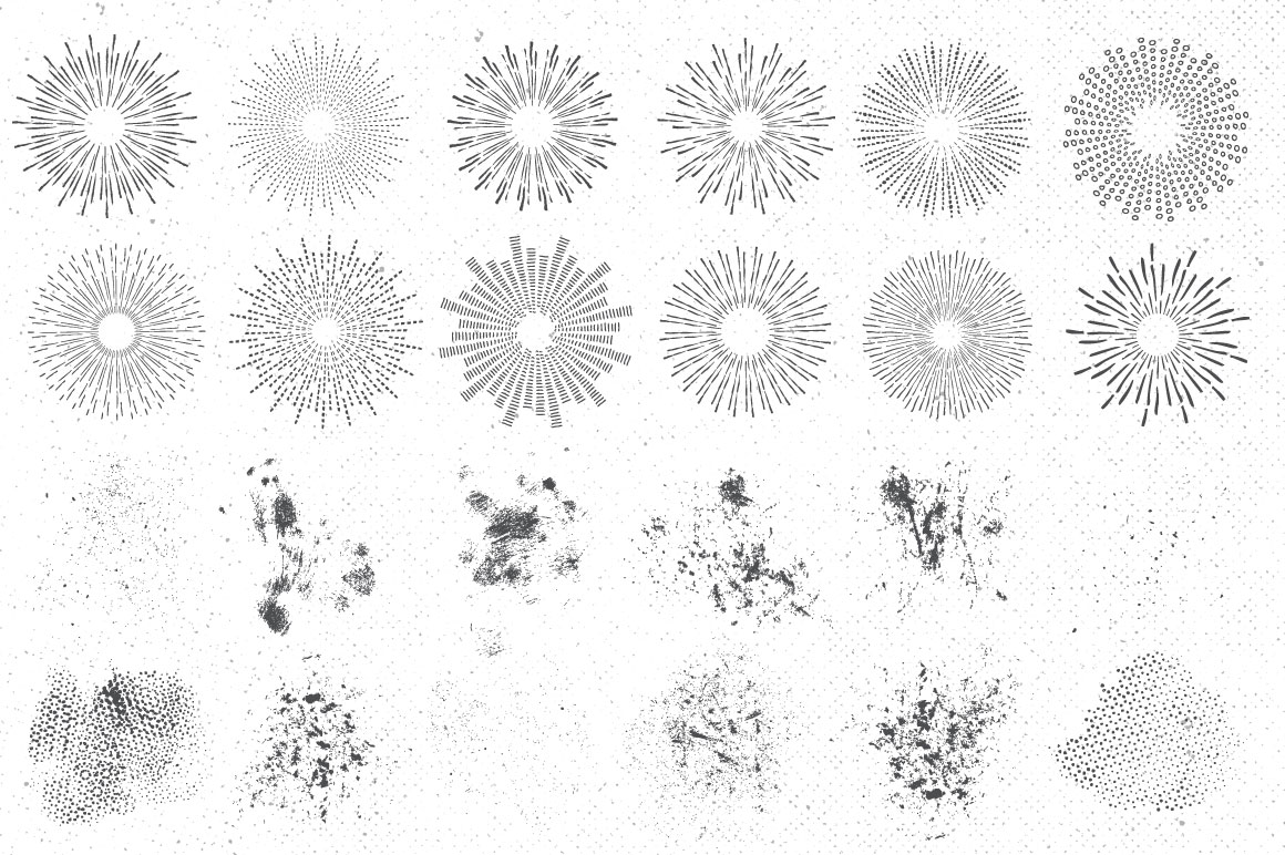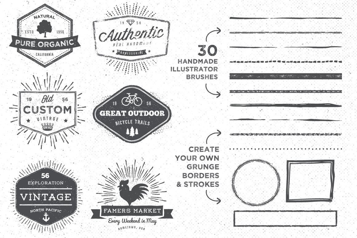 This set features over 120 items! The kit includes everything you need to create old worn out vintage badges, logos and labels. The elements in this kit were inspired by grungy, hand made vintage design. As a bonus, I’ve included 12 pre-made badges using the elements within the set. Here’s what you get: 12 Pre-made vintage badges that are easy to edit and utilize free fonts, 30 Vector art brushes for Adobe Illustrator, 18 Hand drawn, vintage inspired, illustrations, 12 Hand drawn sunburst elements, 20 Pre-made badge shapes that feature distressed borders, 12 Vector grunge texture elements, 12 Hand drawn vector banners, 6 Bitmap textures (these are transparent and editable within Illustrator).