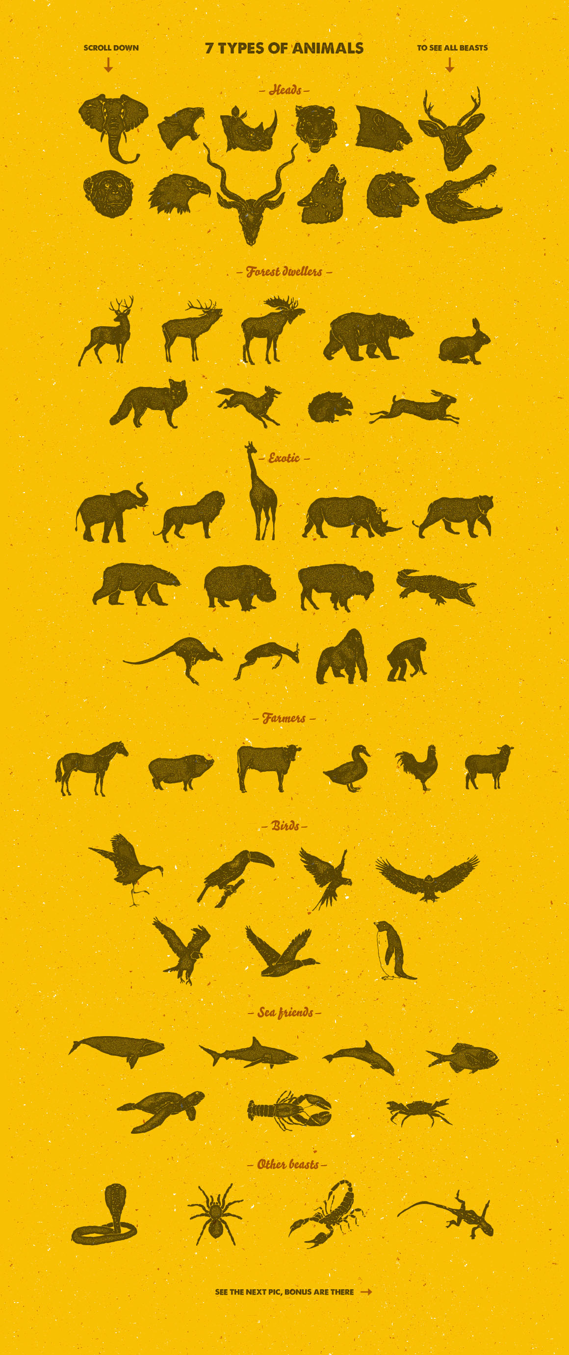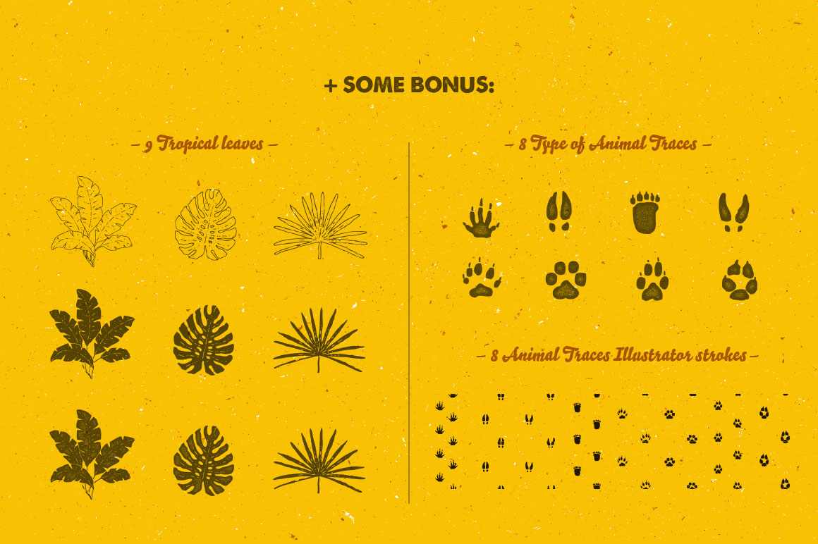 This is a wonderful and magic place – the Earth planet. I can spend hours watching animals, thinking that they now think or feel. So I was inspired all of these feelings, and create this amazing vector pack. Good for your logo’s or something else. If you love a vintage style – this hand drawn pack for your collection. Don’t worry, it’s not just exotically animal pack, this pack includes 6 species of animals and heads for some special designs. Three style of each animal. What included: 58 different animals in three style of each, 3 tropical leaves in three style of each, 8 different animal traces with 8 Illustrator stroke to get traces what you want.