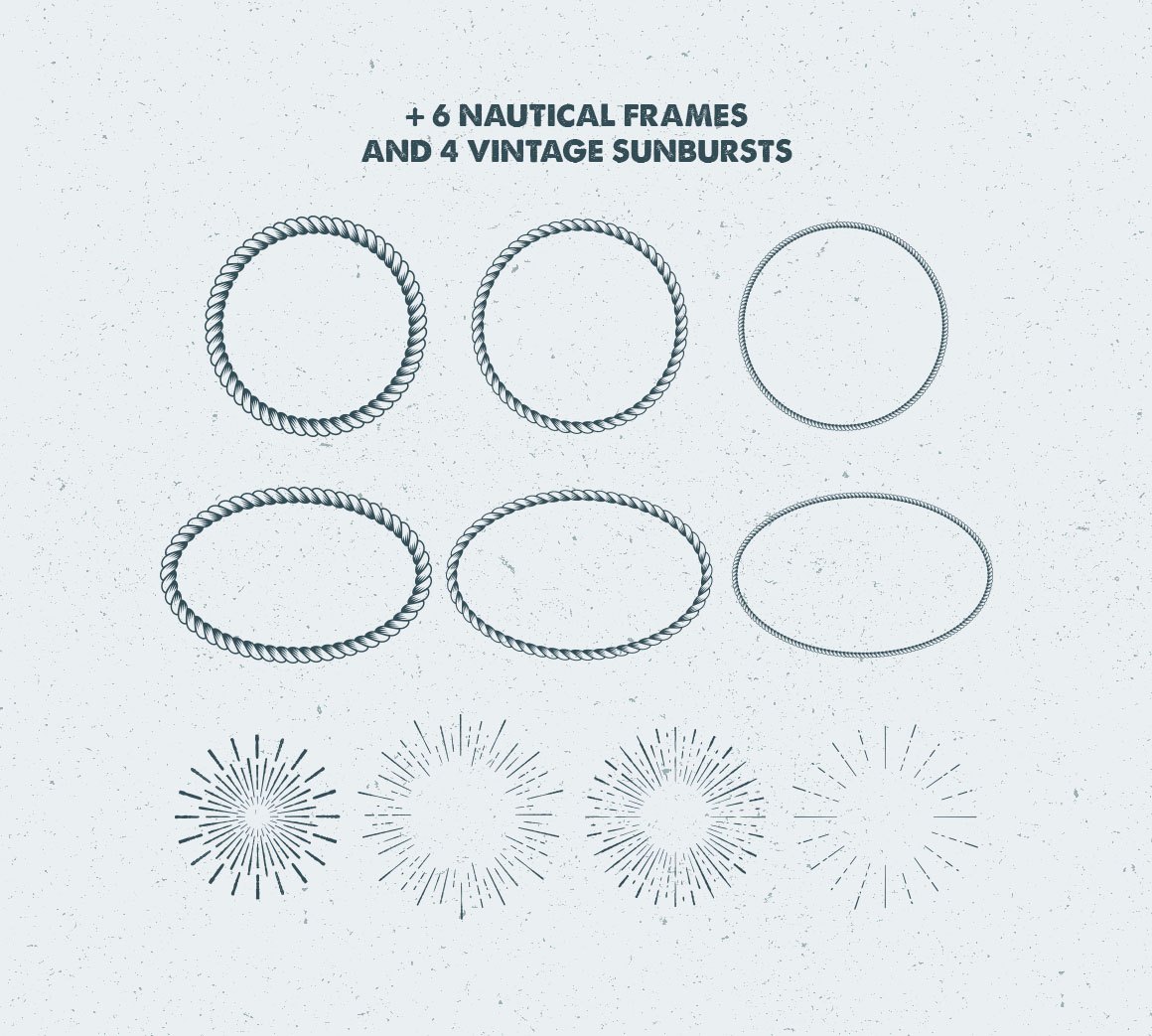 I love the Jules Verne and Jack London novels, and off course can’t doesn’t love nautical themes. So I was inspired by their books, and create this vintage nautical pack for your sailor collection. 68 elements total. Perfect for your vintage nautical logo’s or just for marine design. All elements by hand drawn. What’s inside: 1 eps file with all vector elements including frames and sunbursts., 1 eps file with 3 ready logo with full editable fonts (file with font download links is includes, all fonts are 100% free for personal and commercial use), 1 png file with all nautical elements (4700×5640 px., in 600 dpi).