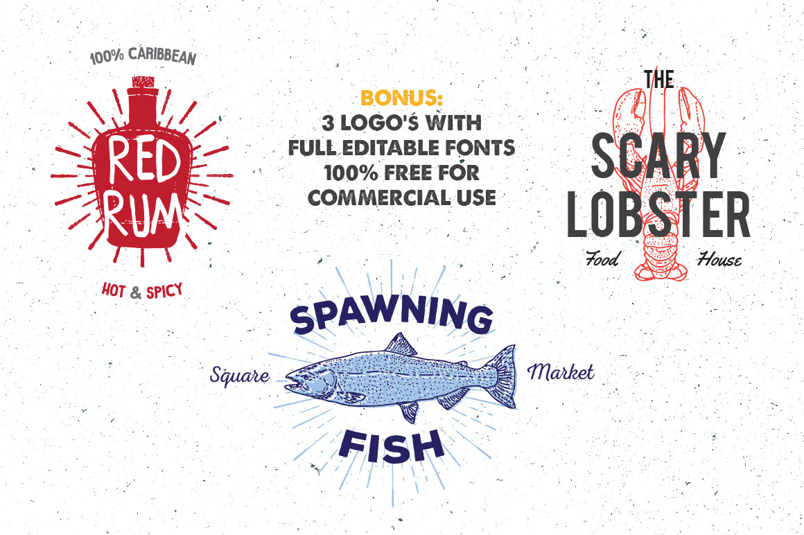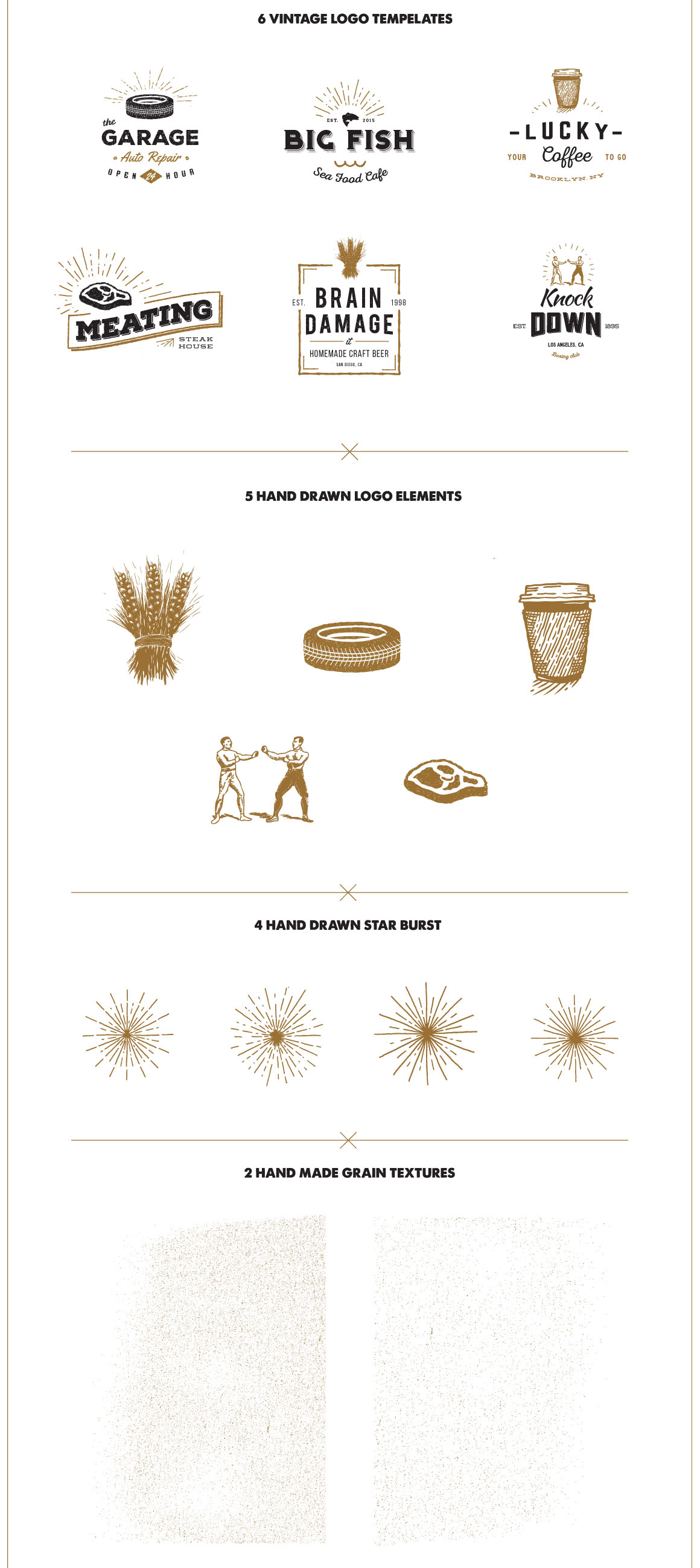 All fonts used in the Logo templates are available freely for download and COMMERCIAL USE (listed in the help file). Simply download and install the listed fonts, open the vector files in Illustrator and get going! The fonts and links to where you can download them for free are included in a text file in the download. This pack includes: 1) 6 pre designed very vintage logo templates 2) 5 Hand drawn vintage illustrations 3) 4 hand drawn sunburst elements 4) 2 grainy hand made texture.