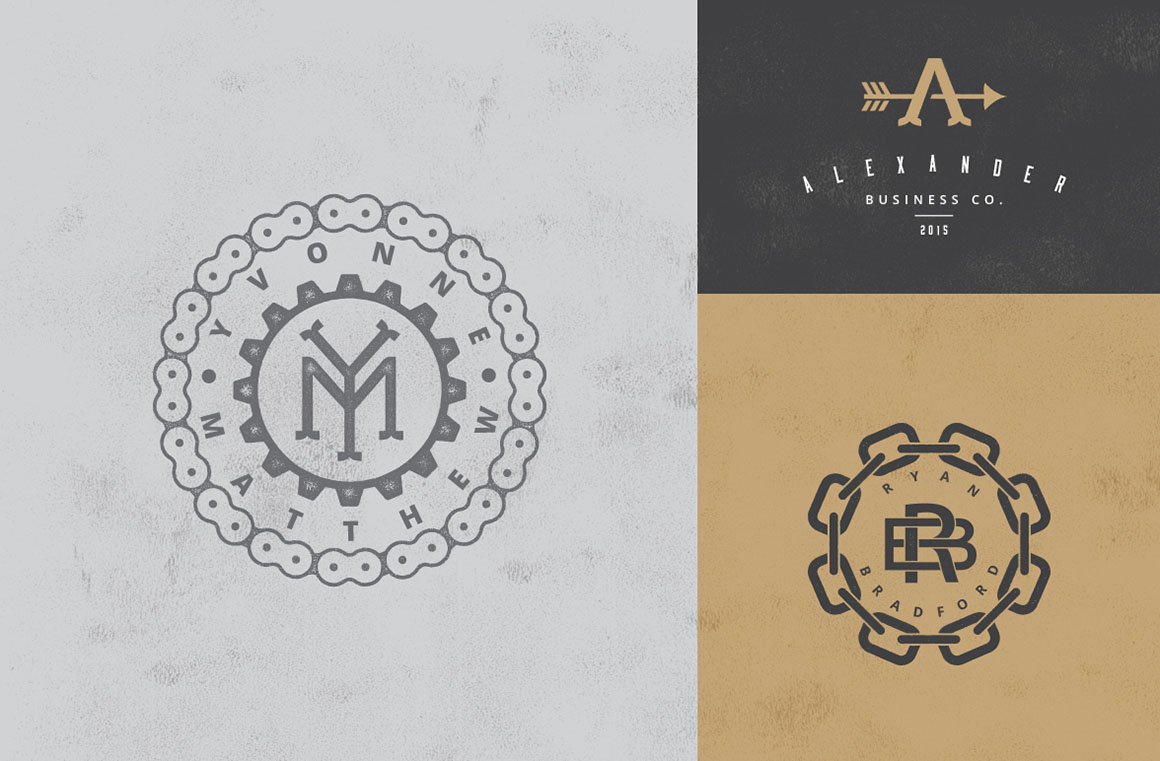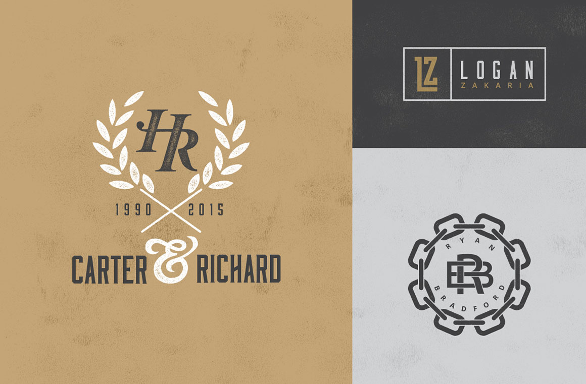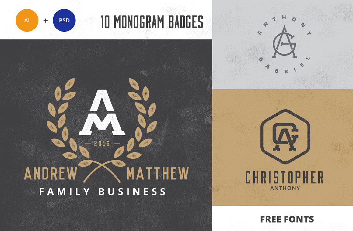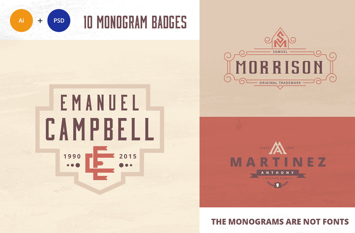 Monogram Badges for Graphic Designers This pack includes 10 carefully crafted vintage style Logo Templates with monogram incorporated for you to use and modify as your own. All fonts used in the Logo templates are available freely for download and are listed in the help file. The monograms are custom built, there are not fonts and can not be changed. Simply download and install the listed fonts, open the vector files in Adobe Illustrator and get going! The fonts are listed in a Read Me file. You can use them as part of your branding, labels ,packaging ,t-shirt designs, and so much more! Files included are : AI, EPS, PSD.