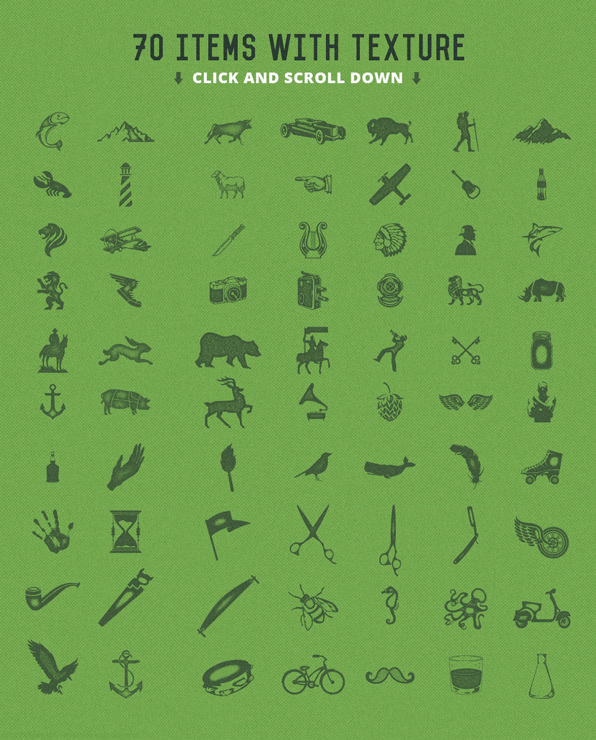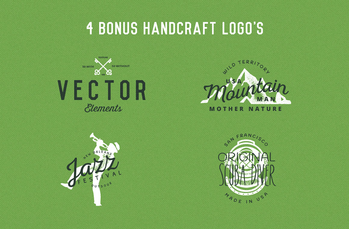 140 vector elements, 4 bonus Handcraft logo’s. You will get: 70 vector elements with texture Ai,Eps,PSD, 70 vector elements without texture Ai,Eps,PSD, 4 bonus logo’s Ai,Eps ( fonts are listed in the Reade Me file ). With this set of elements it will be really easy for you to create vintage-looking premium quality logo or any other kind of graphic image (example: the bonus logos). Just combine some elements of this pack and add some text and you have a super looking graphic art.