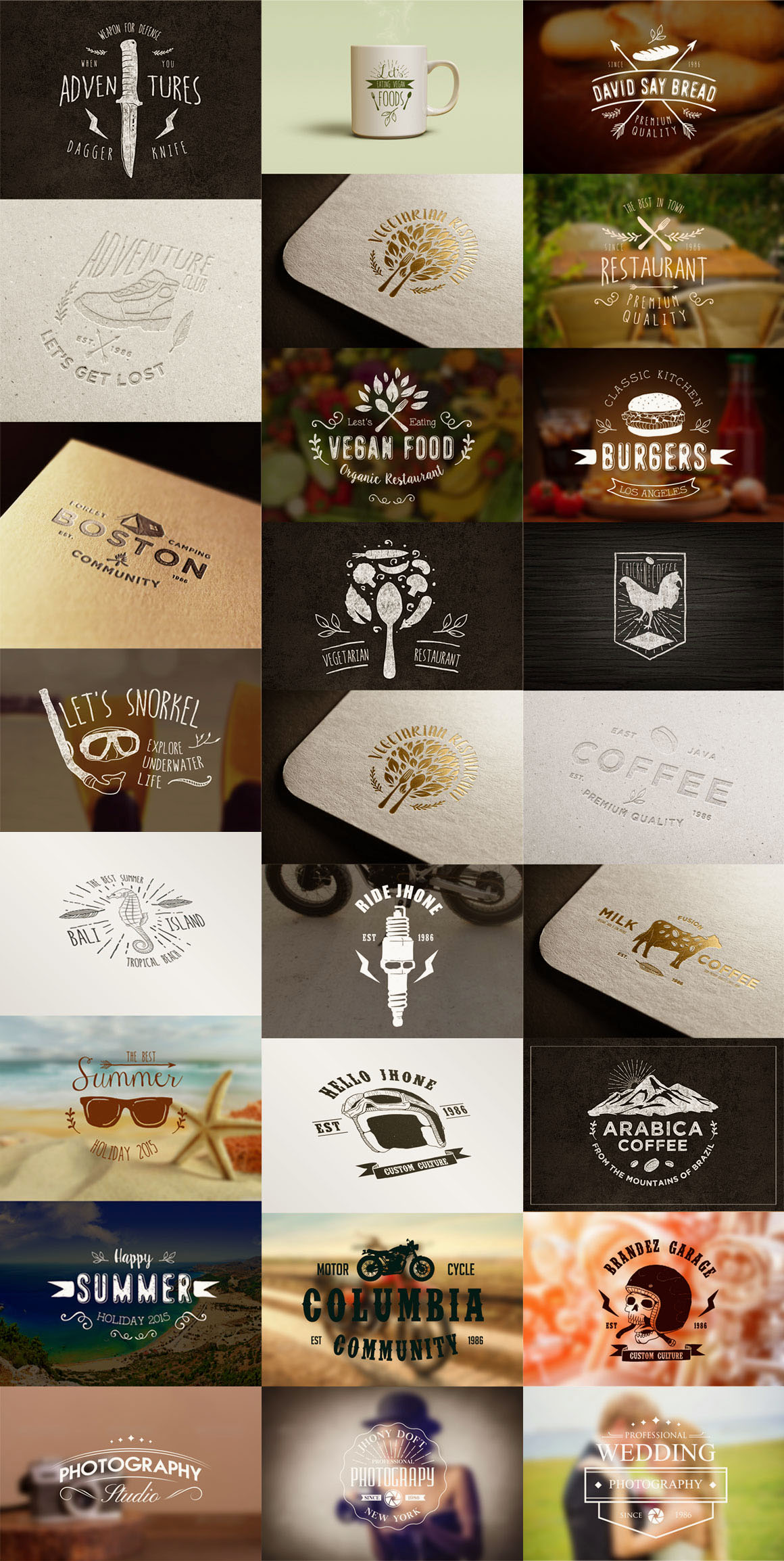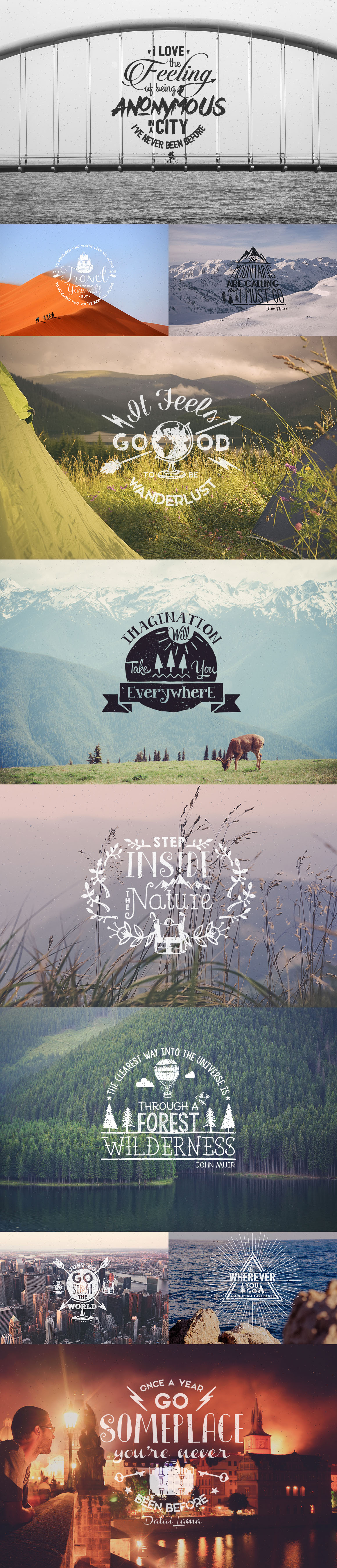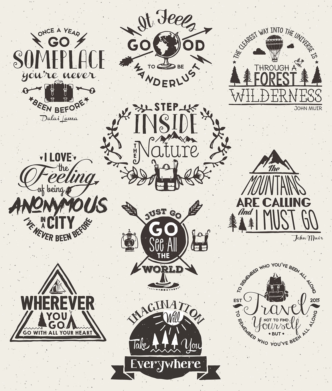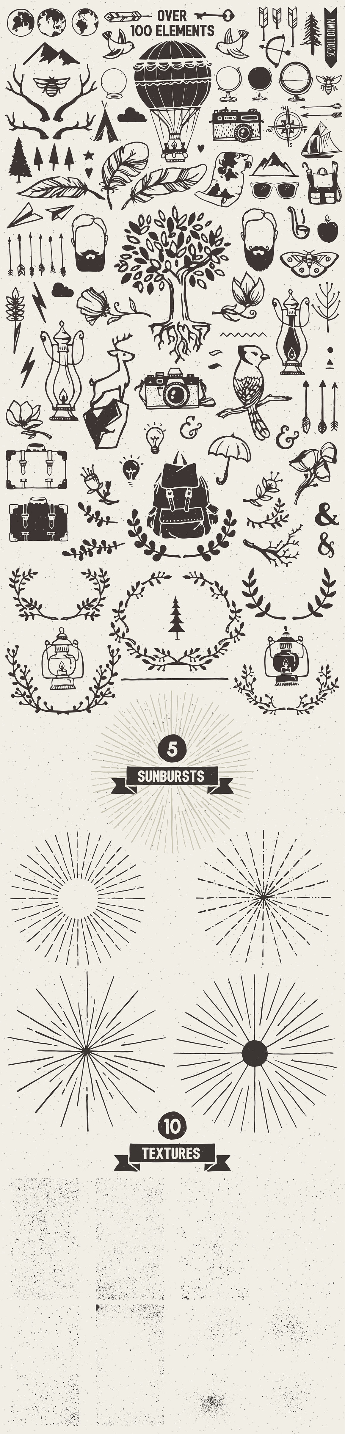 Entire concept of the Wanderlust Logo Pack was inspired from the mad desire of traveling that lives in most of us, that is so beautifully named Wanderlust. The pack is stuffed with 10 Logo Templates, 10 vector textures, few sunbursts and a lot of hand drawn elements, just perfect for creating branding identity, logos, greeting cards, wedding invitations, patterns and that’s not all! An awesome bonus of 9 Label Shapes to explore your creativity.
