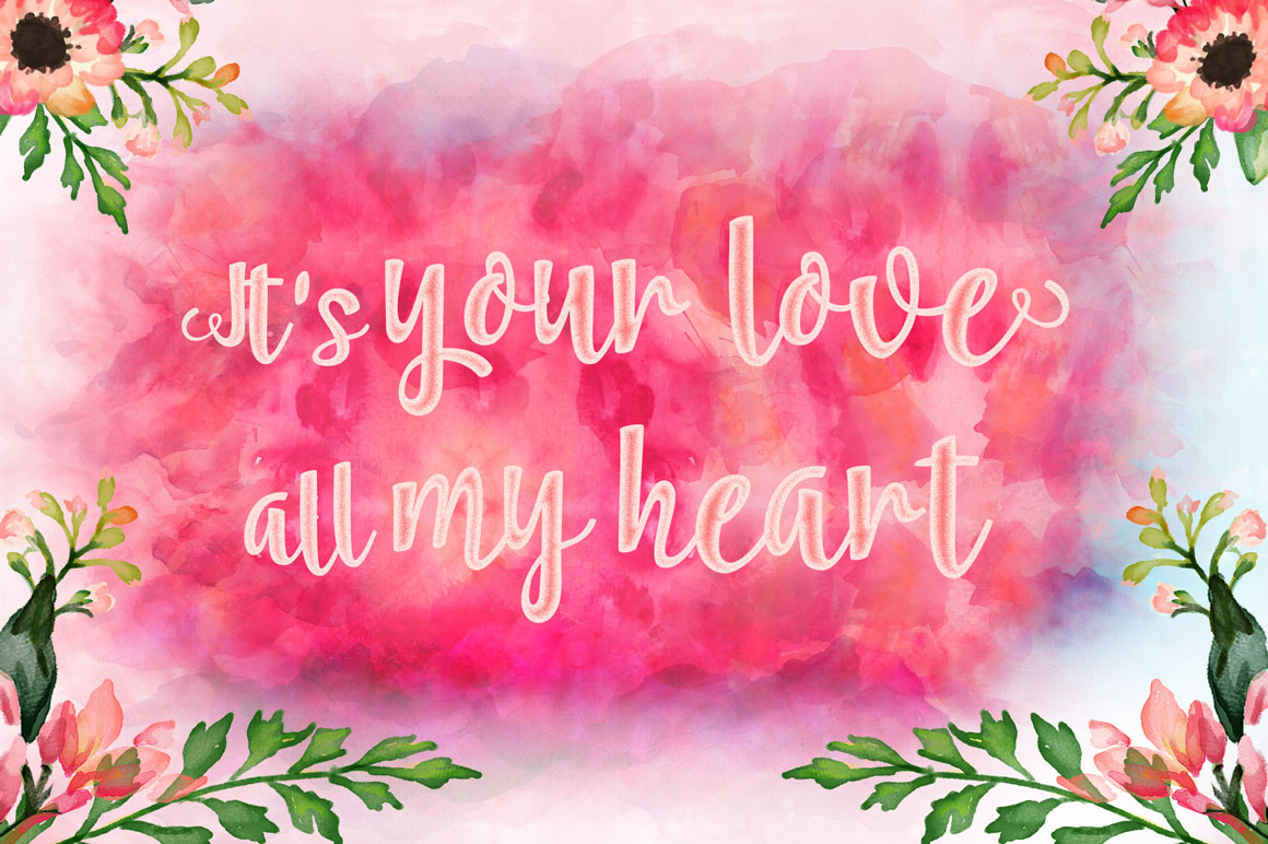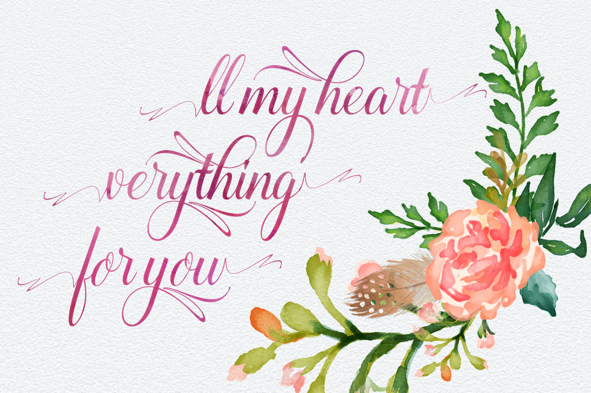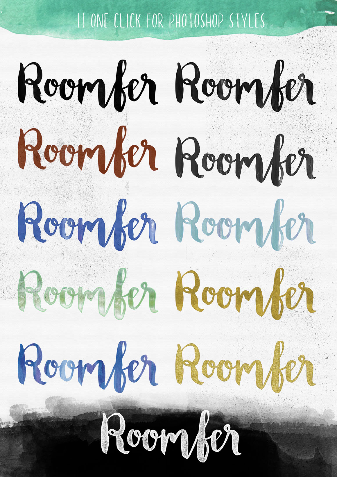 Roomfer font is suitable for use as the title text, logotype, hand drawing design concept, wedding invitations name etc. As a bonus you’ll get Roomfer Sant Serif font and also 11 watercolors styles for one click photoshop.