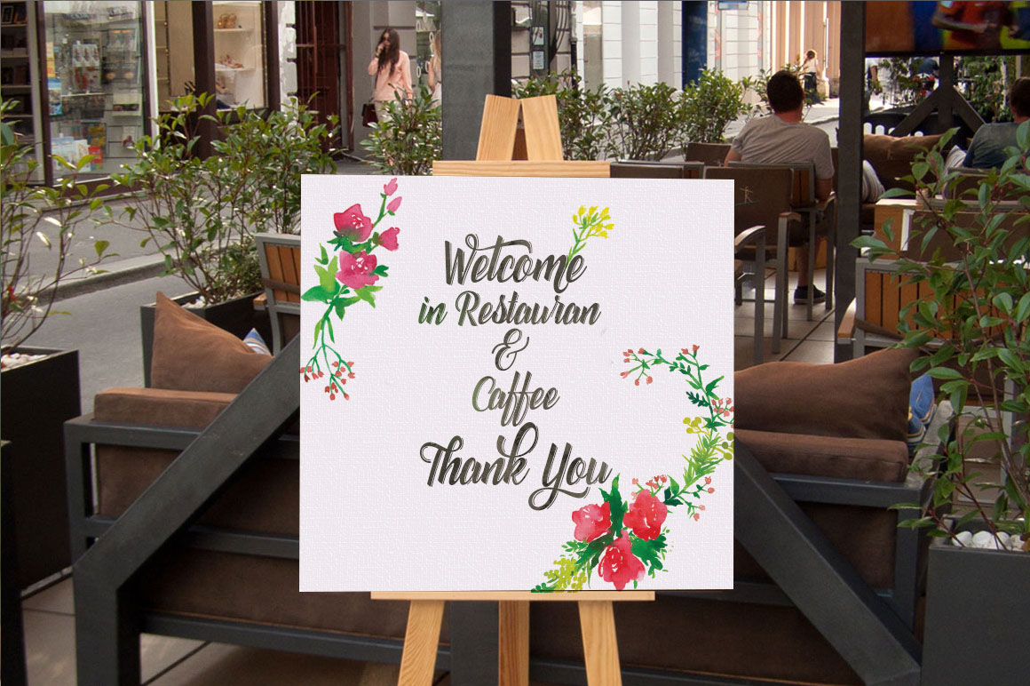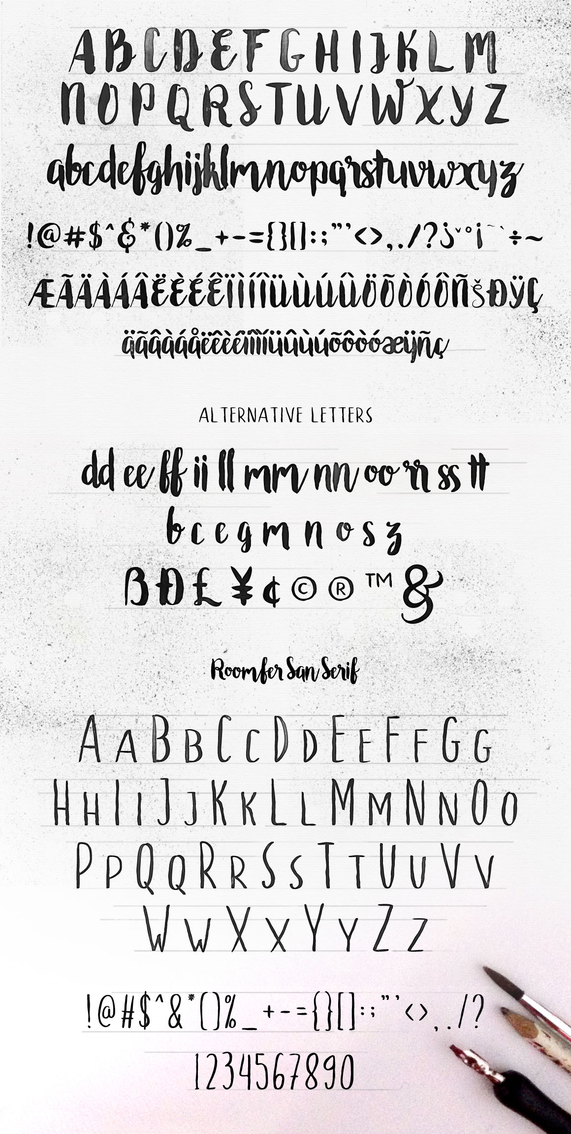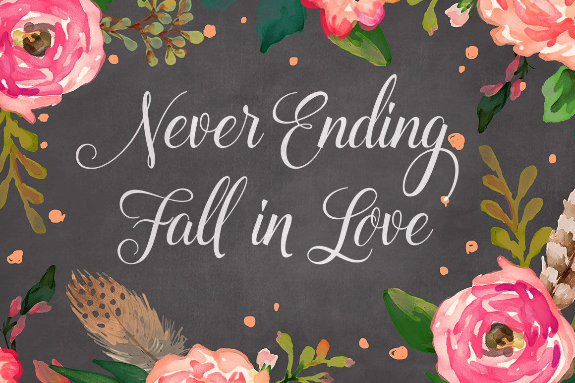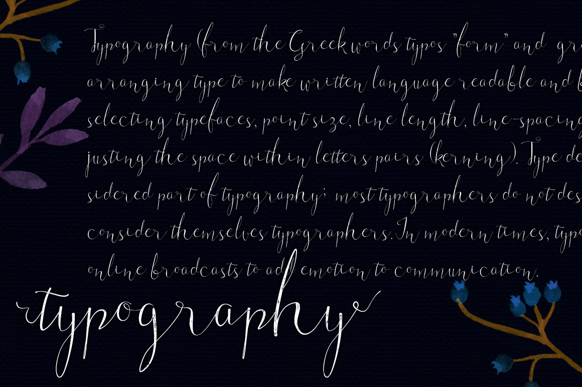 Roomfer font is suitable for use as the title text, logotype, hand drawing design concept, wedding invitations name etc. As a bonus you’ll get Roomfer Sant Serif font and also 11 watercolors styles for one click photoshop.