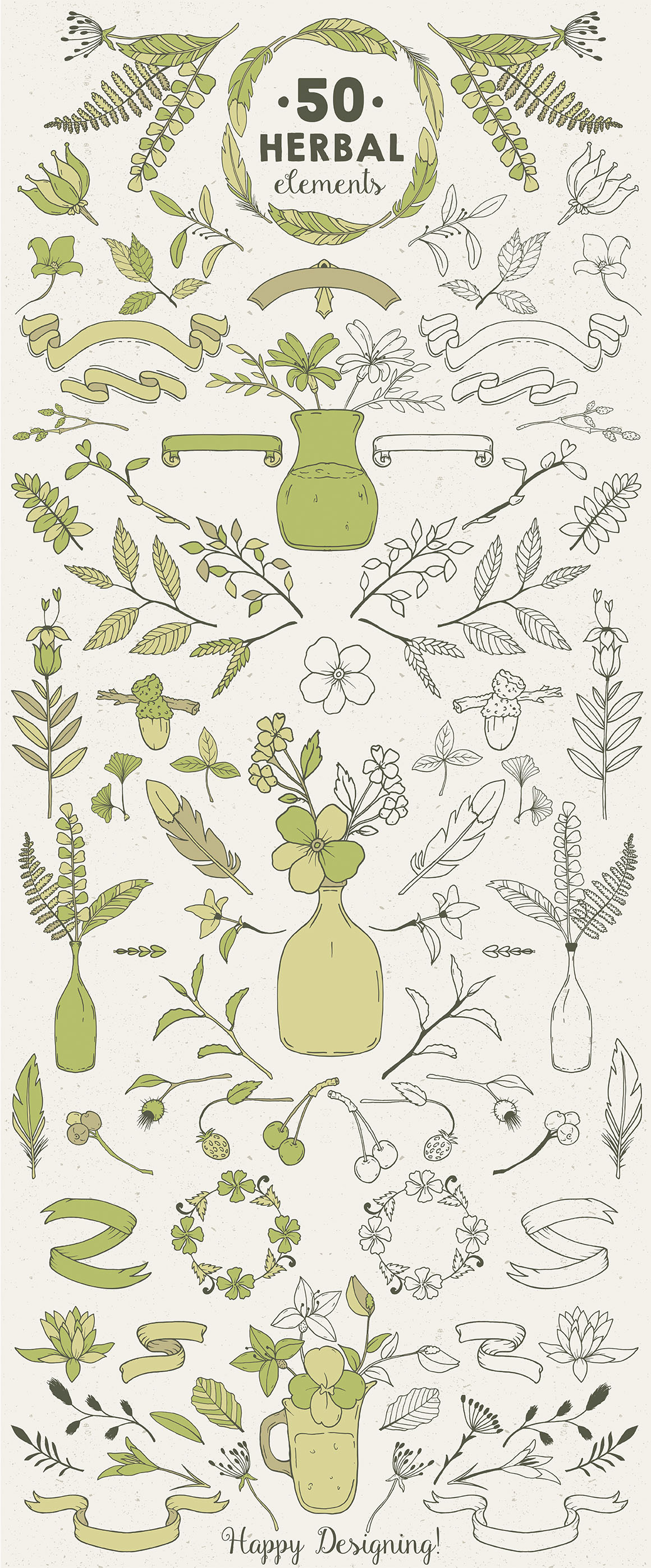I’m happy to present you a vector Herbal Mini Pack of Logos & Elements created in collaboration with TREASURE BOX. We’ve packed the kit with 6 premade logos and 50 unique hand drawn graphic elements. You’ll find a lot of carefully crafted herbal elements, ribbons, flowers, plants, branches, and feathers. Outlined versions are not counted. In my opinion you can use the pack to create unique greeting cards, logos, branding identities or simply decorate your blog. In this bundle: 6 Logo Templates, 50 Hand Drawn Elements, BONUS: 15 Vector Textures.