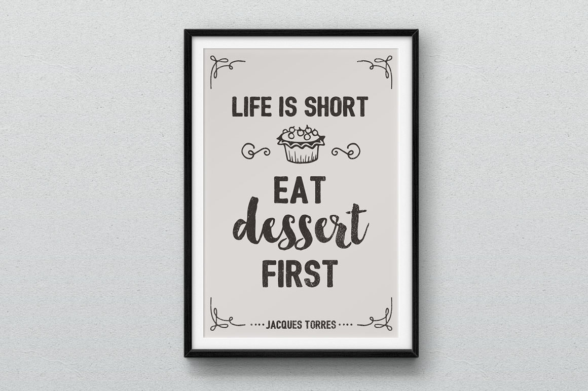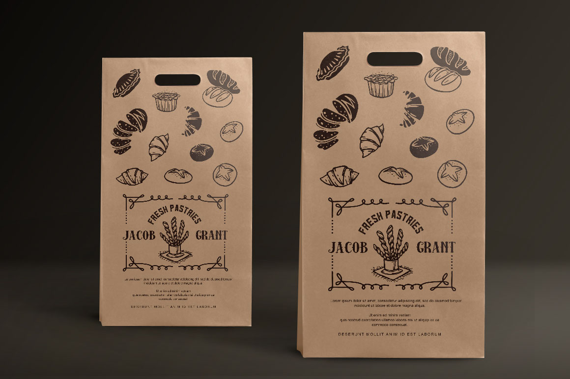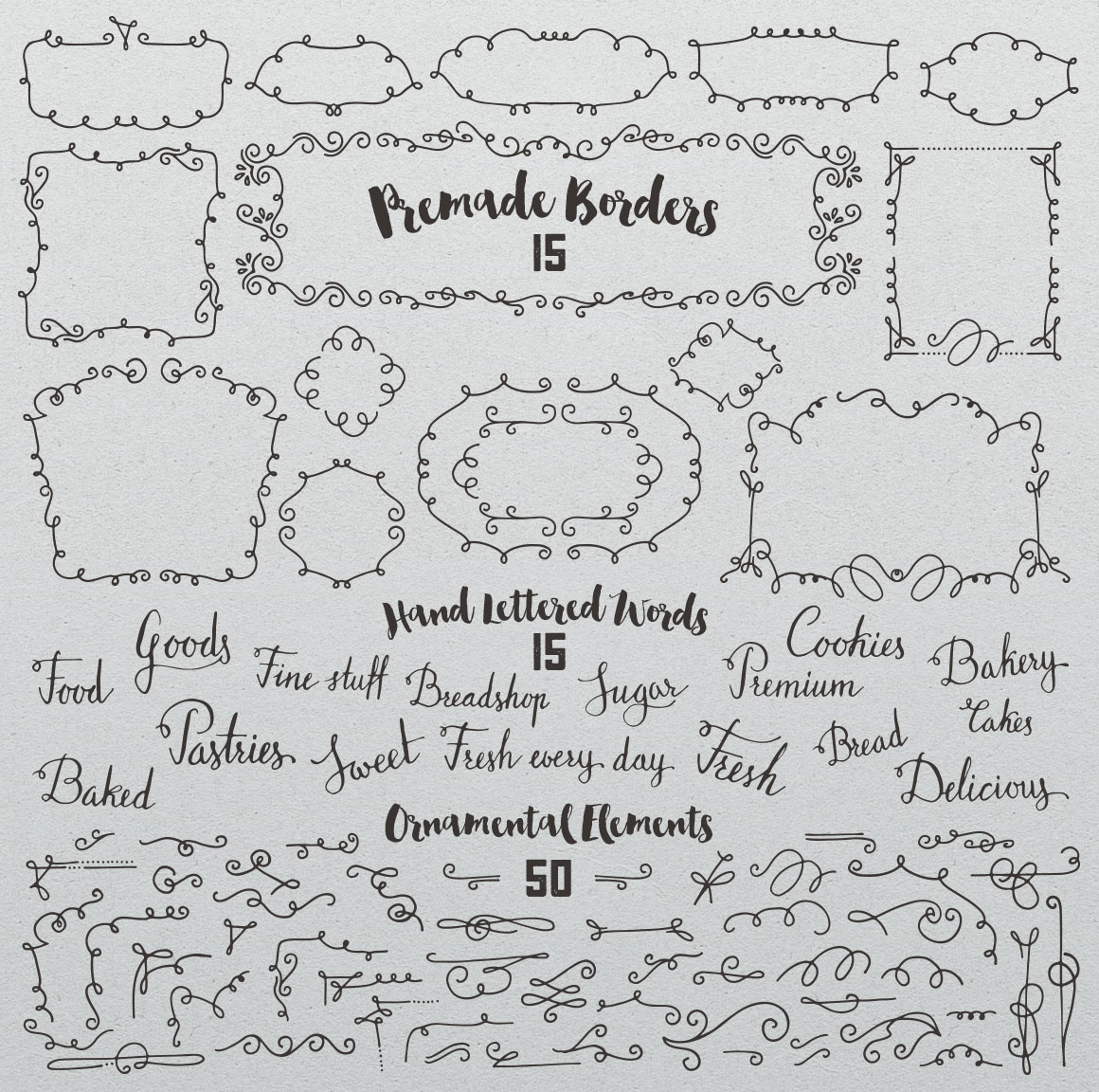 Bakery Yummies carefully hand drawn, scanned at 300 dpi and then cleaned to bring you some elements related to bakery in case you need them. This elements are perfect for designing posters, branding identities, logos, flyers, scrapbooks, packaging, greeting cards or any other projects with a bakery theme. Included in this pack: 53 Vector Bakery Elements: croissants, breads, cookies, cakes…Duplicates aren’t counted, 50 Swirls and Curls, 15 Premade borders, 15 Hand Lettered Words.