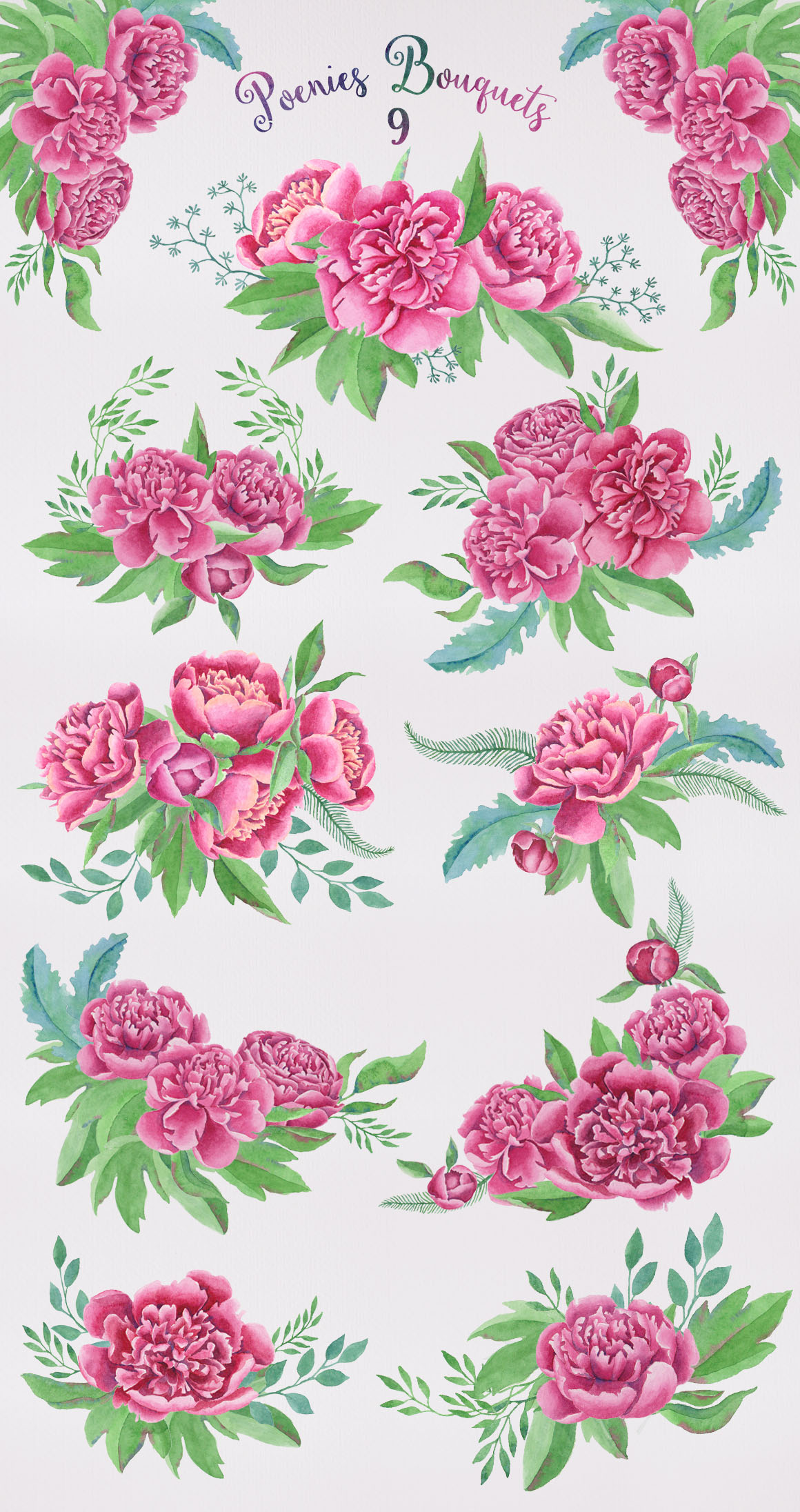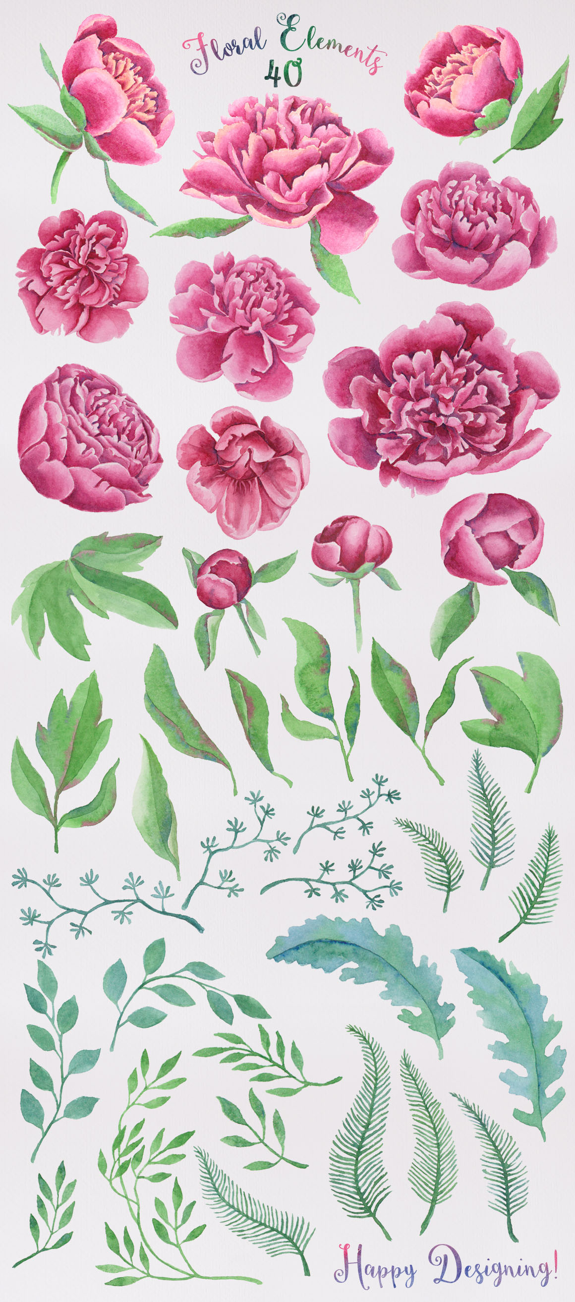 I’ve decided to draw some watercolour flowers separated in different packs (more to come) and this is one of them, I’ve painted them with a lot of passion and dedication, from there comes the title: Passion for Peonies is a pack of awesome pink hand painted watercolor peonies and leaves, these are perfect graphic for wedding invitations, greeting cards, posters, quotes and more. What’s Included: 40 Floral Elements, PSD file, separated transparent PNG files (from 375 to 1300px), 9 Peonies Bouquets, PSD file, separated transparent PNG files (from 1770 to 3360px).