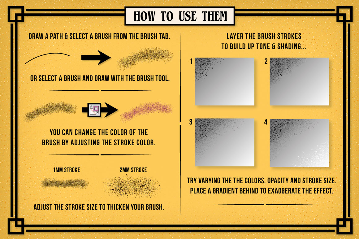 Add texture and flare to your designs and illustrations with this set of 15 scatter brushes! To use the brushes simply select a brush from the tab and draw with the brush tool. The color and stroke width can be adjusted as required.