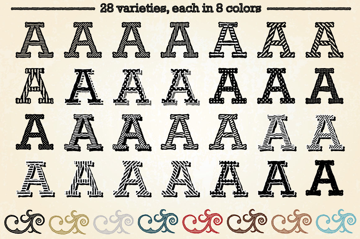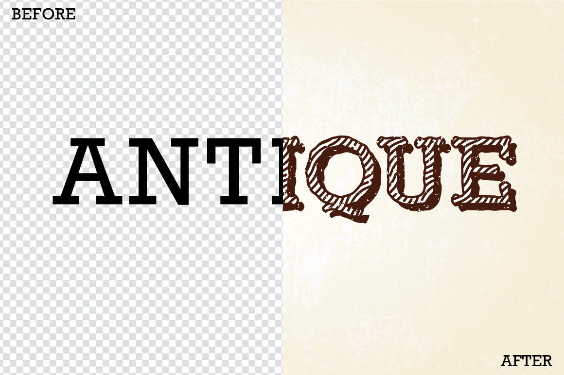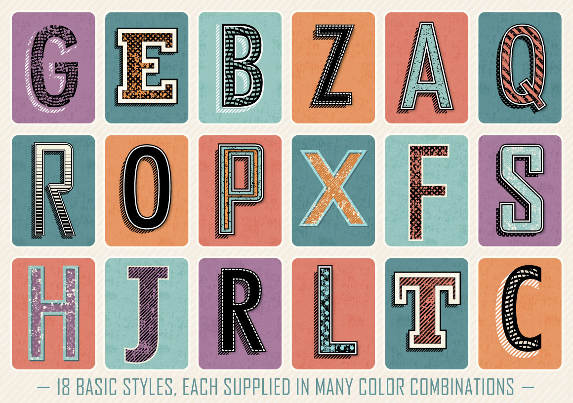 Give text the vintage print treatment with this set of antique vector styles! Layer styles allow you to quickly change the look of text and objects with just one click! 28 different varieties, each in 8 colors and patterns that were used to create the styles.