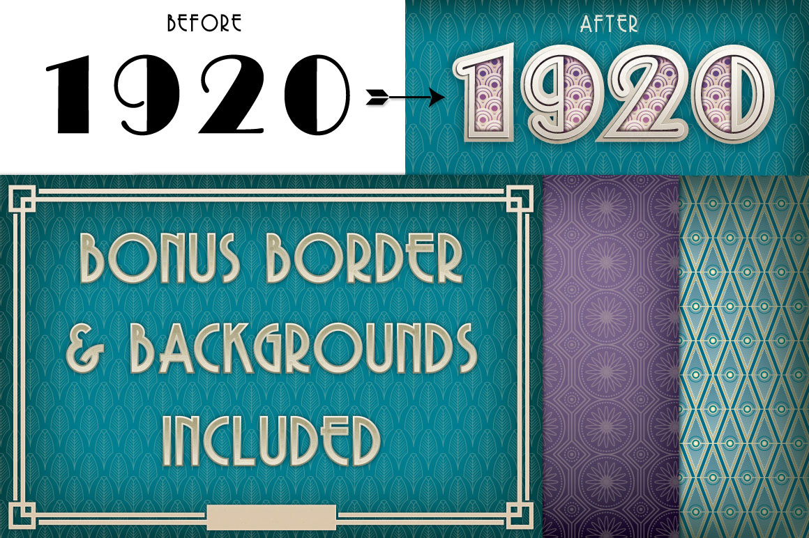 Make you headlines look like they’re from the roaring twenties with these vintage styles! Layer styles allow you to quickly change the look of text and objects with just one click! Because these are in vector format they can be enlarged almost infinitely without loss of resolution. What’s included: An Illustrator EPS containing all 10 styles, 3 art deco Backgrounds and the border used in the preview, Instructions.