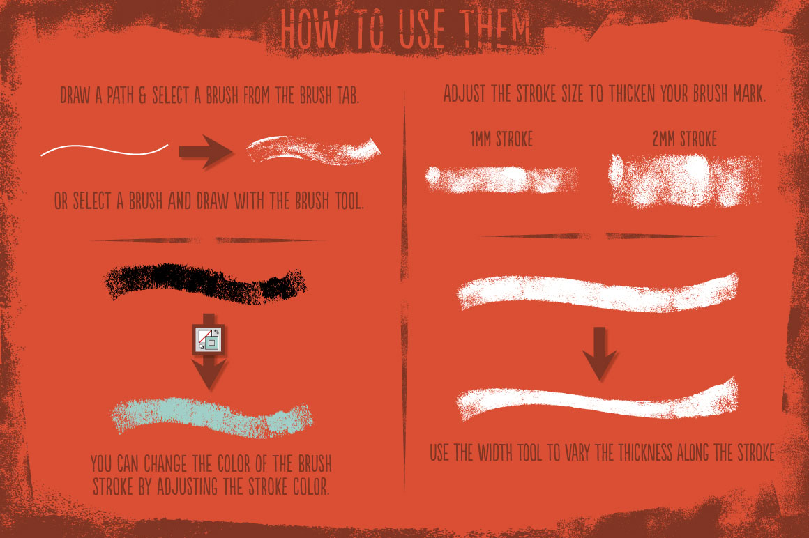 My Hand-rolled Ink Brushes are perfect for adding messy realism to your work! Take a look at the preview to see how many uses they have – Almost everything that you will see was created using the brushes. They’re ideal for line art, text, borders, backgrounds and for texturing designs and illustrations. What’s included: 30 Rolled Ink brushes, A demo file – Page one of the preview – so you can see how I achieved effects shown (CS5 to CC only), Instructions.
