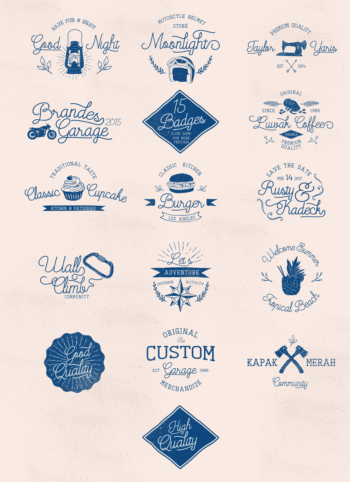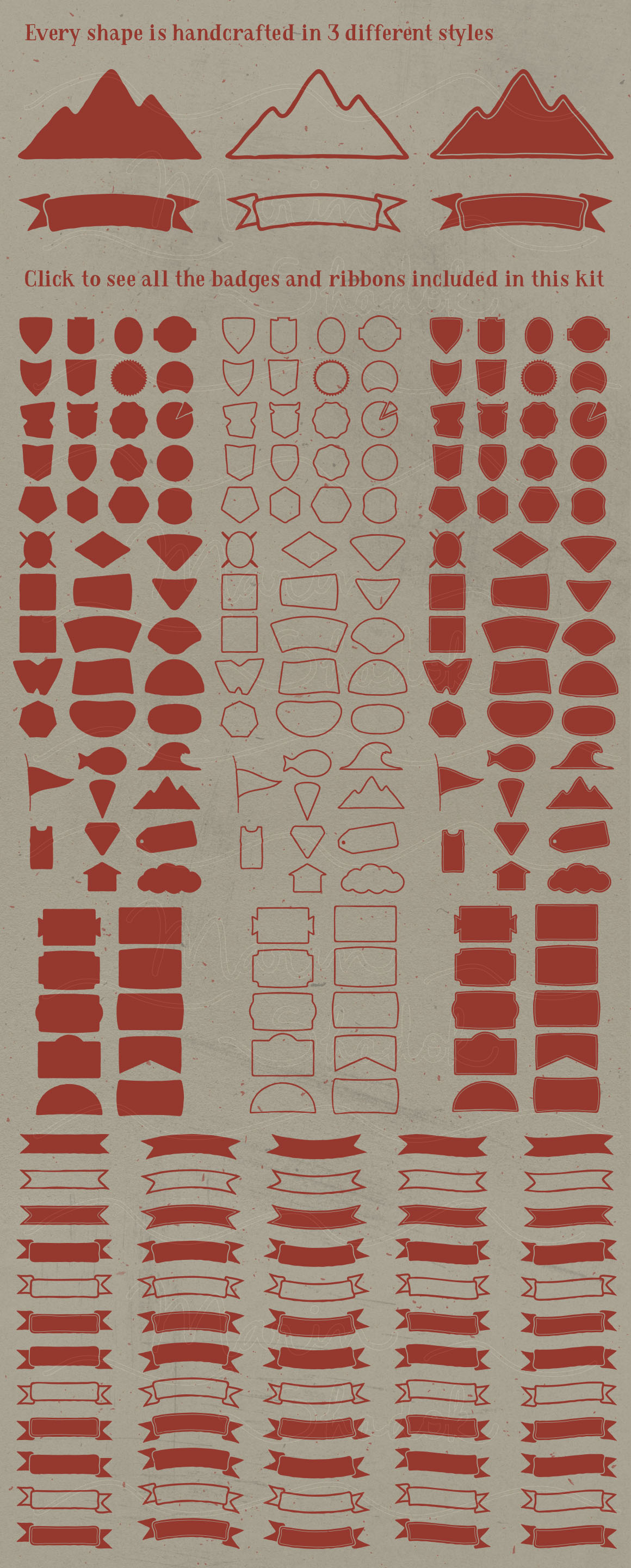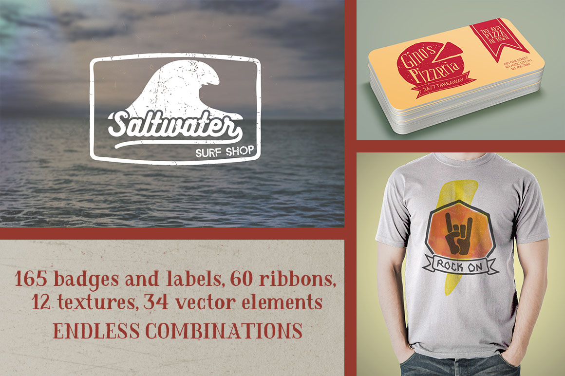 Everything you need to create vintage logos! Every element in this kit is included as AI, EPS and PSD smart object files In this kit, you get : 55 badges and labels in 3 different styles = 165 badges and labels, 20 ribbons in 3 different styles = 60 ribbons, 12 vector textures, bonus : 34 hand drawn vector elements.