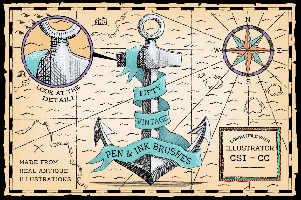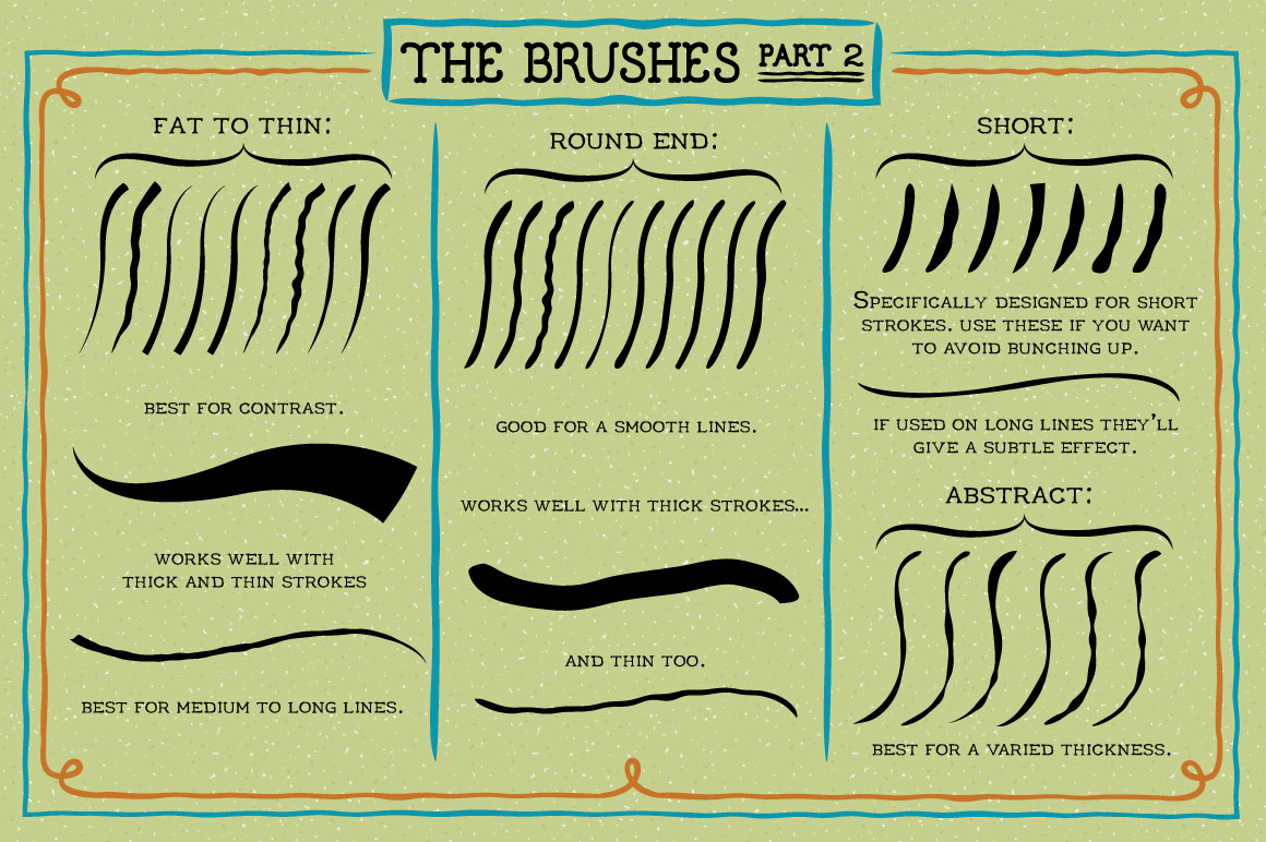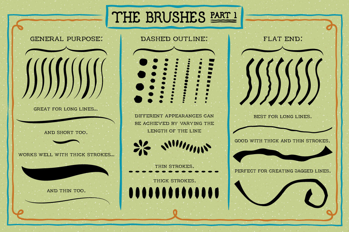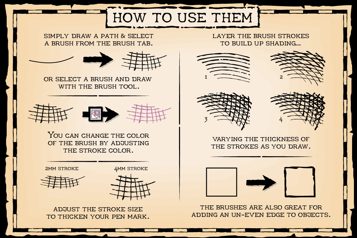 Draw like a Victorian illustrator with this set of 50 art brushes! To use the brushes simply select a brush and draw with the brush tool. The color and stroke width can be changed as required. The majority of what you see in the preview was created using the brushes and I’ve included the first page image in the download so you can see exactly how to use them.