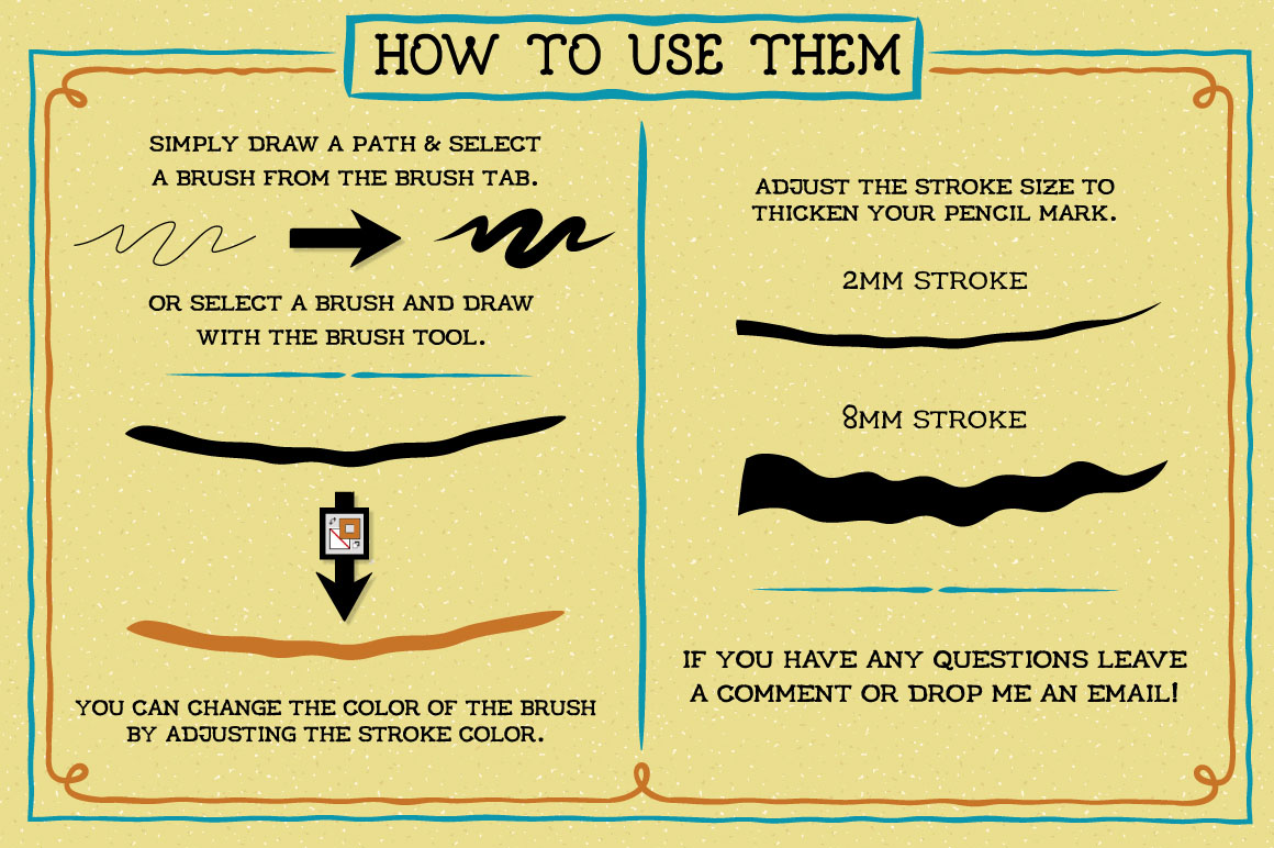 Make your digital artwork and designs spring to life with this massive set of 60 art brushes! Do you find yourself spending precious time adjusting the stroke widths and end shapes of your Illustrator brush marks? If so them these brushes are for you. I created the set to speed up the process of drawing in varied thicknesses and give a more life-like look to vector drawings. To use the brushes simply select a brush from the tab and draw with the brush tool. The color and width can be adjusted as required.