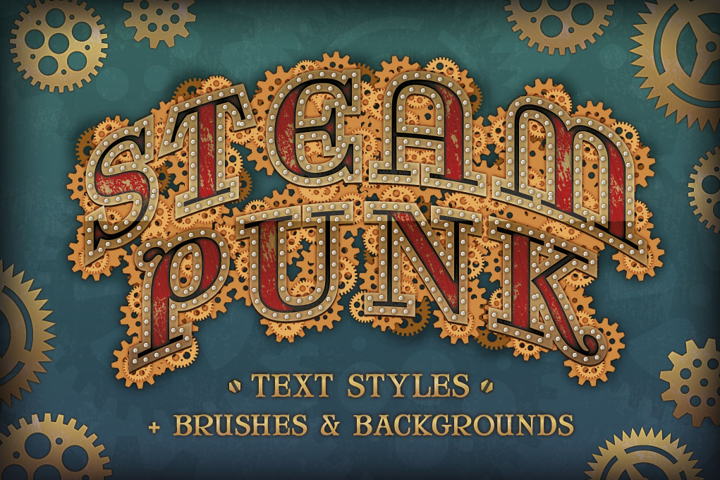 Transform your text with my highly detailed Steam Punk Text Styles! Layer styles allow you to quickly change the look of text and objects with just one click! What’s included: The 5 Steam Punk Styles, A set of bolt, nail and screw brushes, Everything else you see in the preview – cogs backgrounds etc, Instructions.