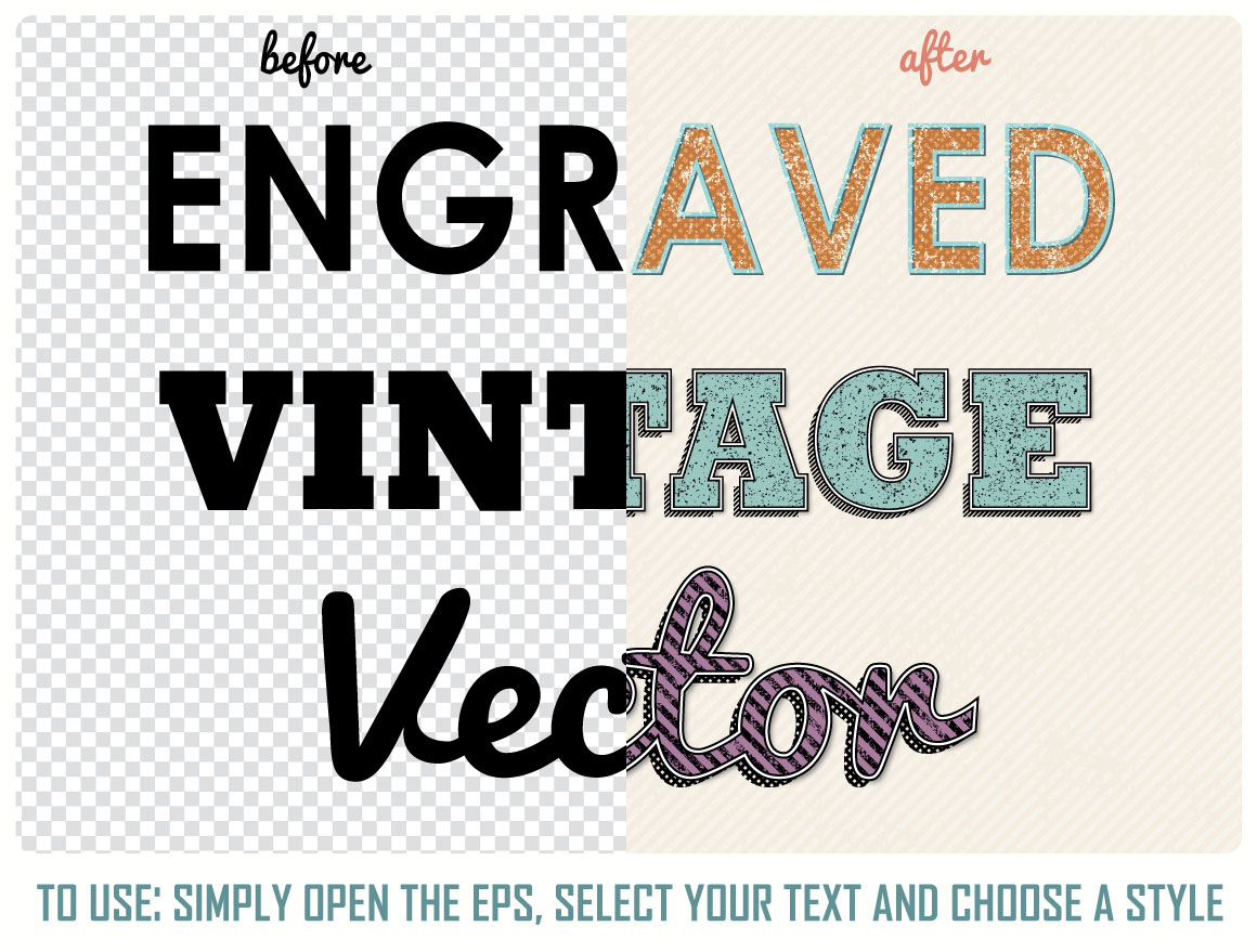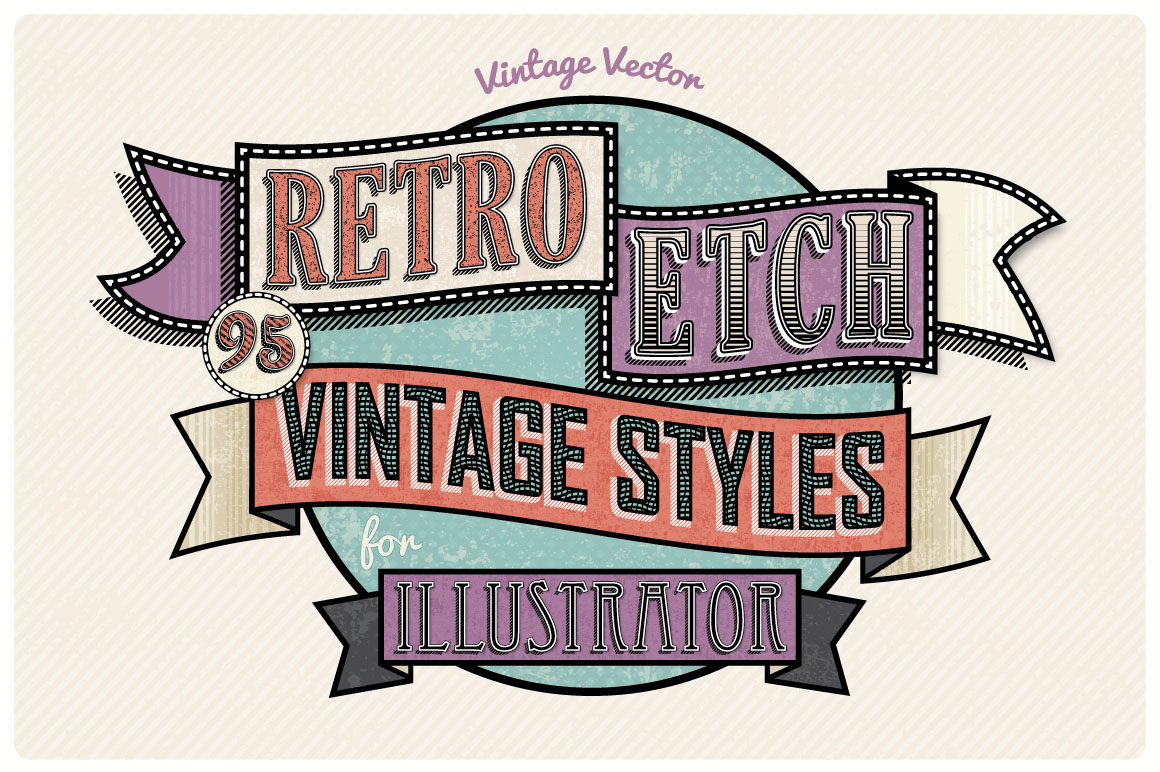 Age your headlines with these vintage etched and engraved styles! Layer styles allow you to quickly change the look of text and objects with just one click! Because these are in vector format they can be enlarged almost infinitely without loss of resolution. What’s included: An Illustrator EPS containing all 95 styles, Examples of the styles applied to text with appropriate backgrounds (as shown in the second screen grab), A BONUS set of retro color swatches which are designed to work with the styles, Instructions.