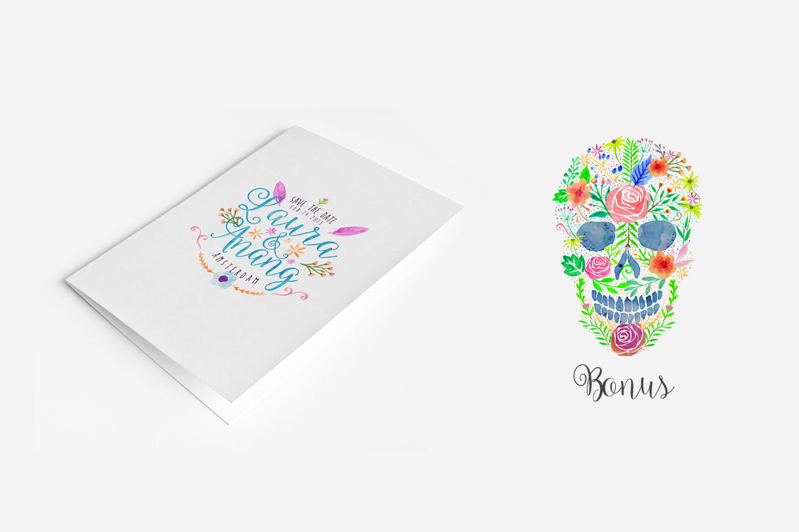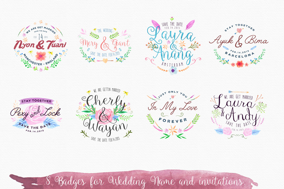 In this bundle: 117 watercolor shapes, 6 PNG patterns with transparent background, 1 watercolor.pat ( pattern format for photoshop ), 8 badges for wedding (editable text), bonus skull using flower patterns.
