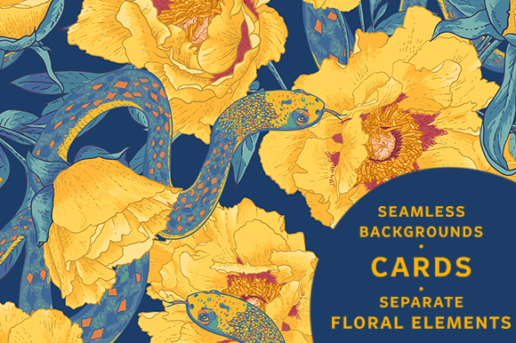 Vintage greeting card and seamless patterns with snakes with blooming yellow flowers on a dark blue background, Invitation, Frame, Vector Design element.
