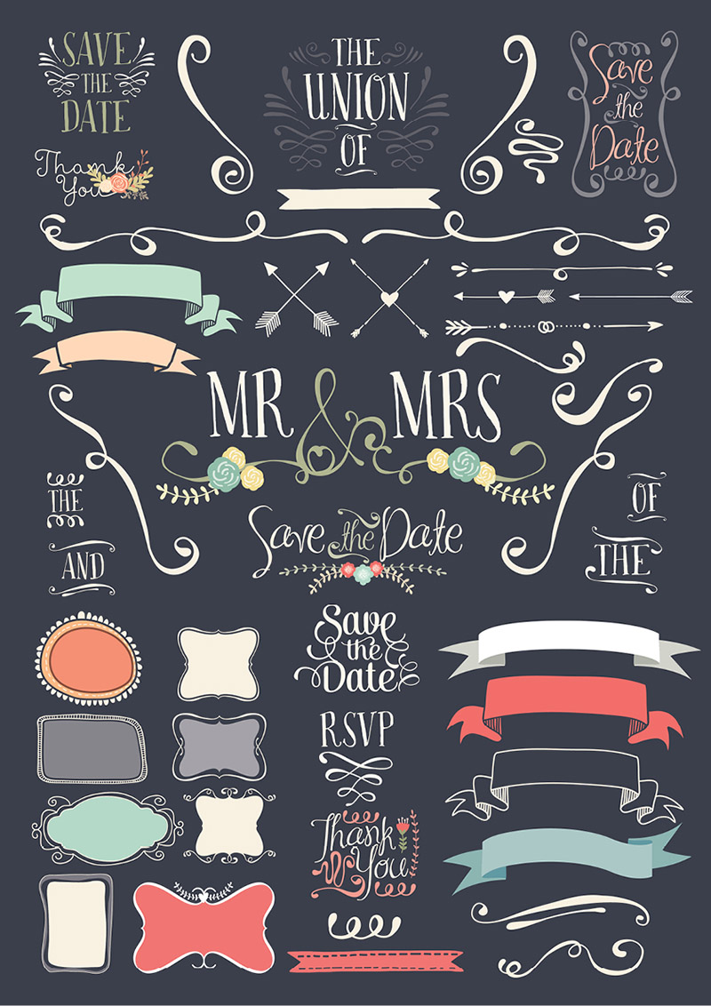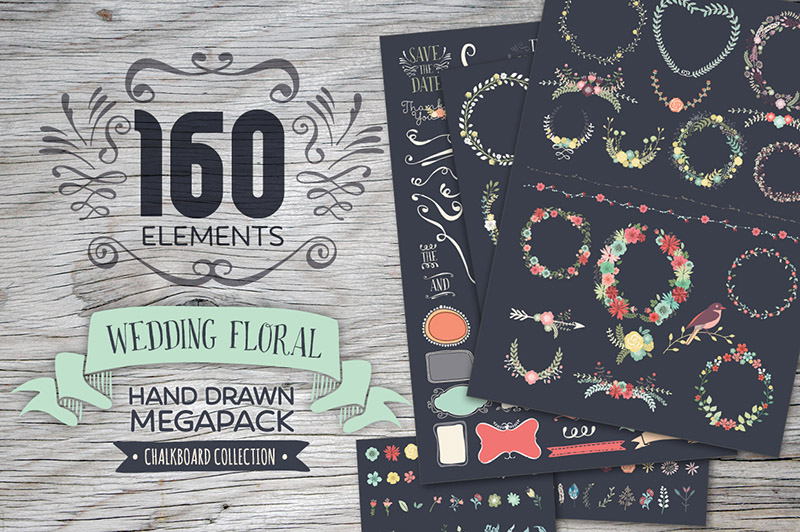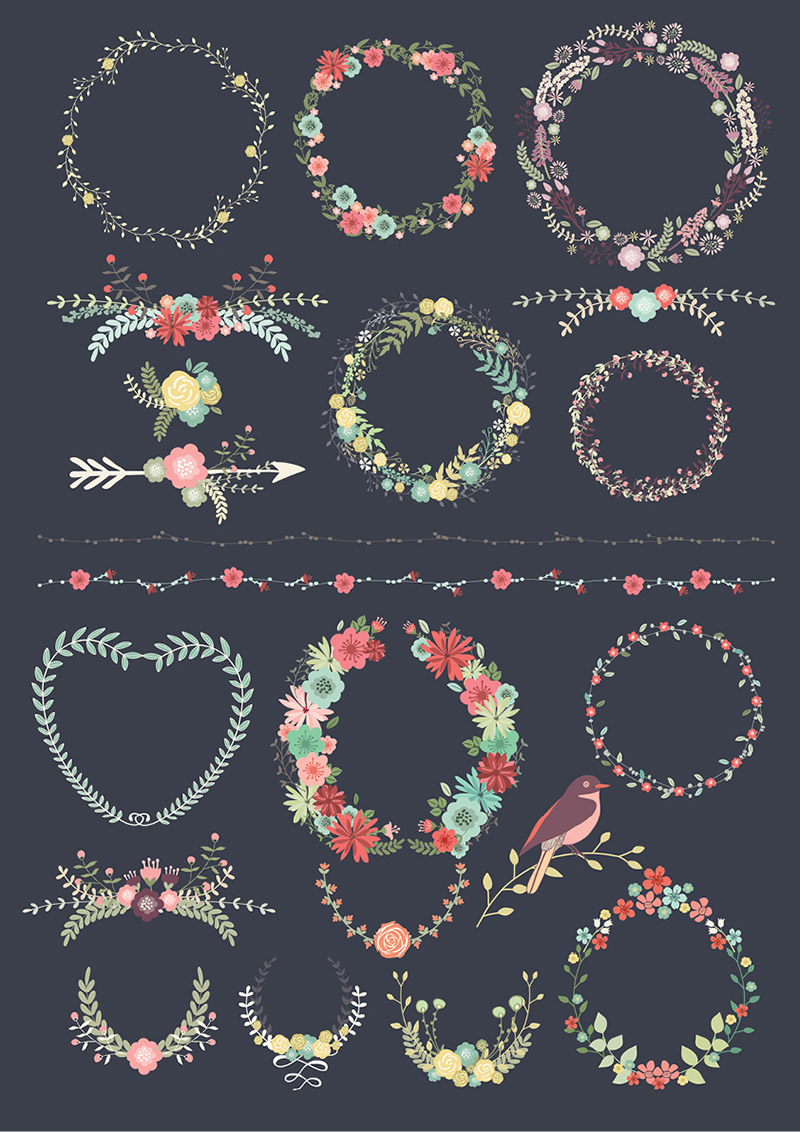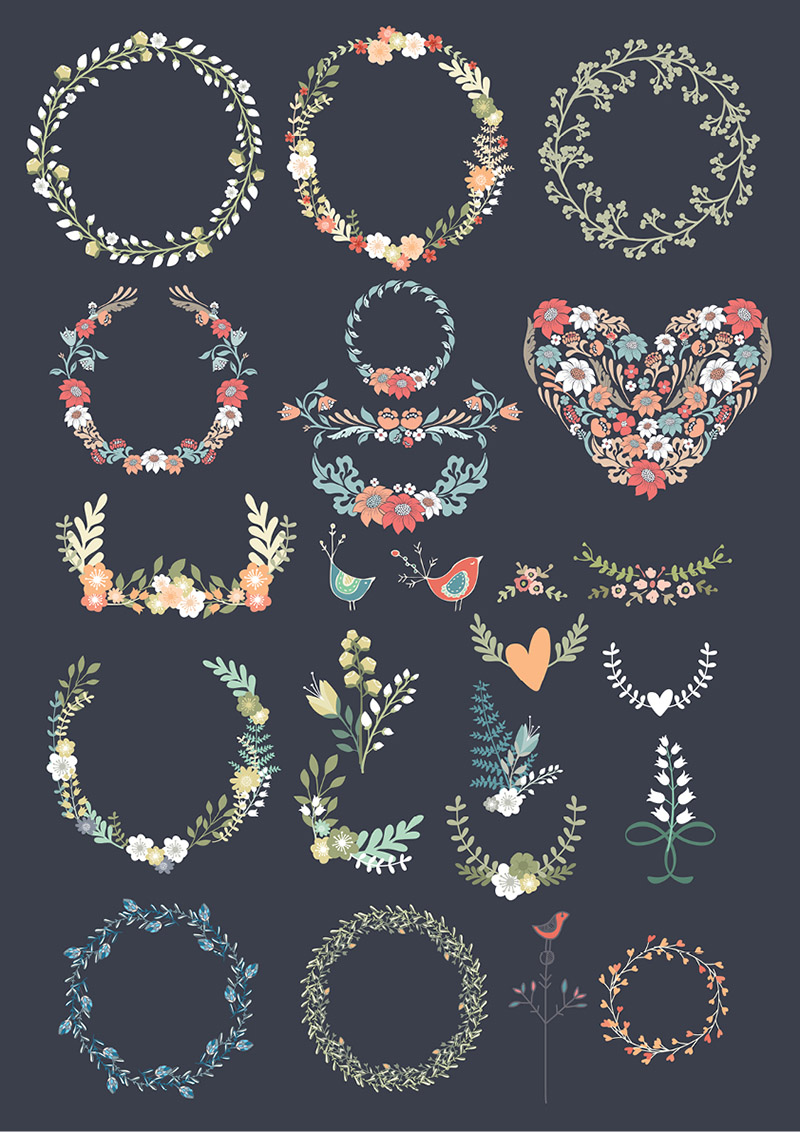 Inspired by vintage fairytale books, I’m excited to present my latest wedding floral collection! With meticulous care, I’ve kept the authentic look of a hand sketched illustration, but still provided you with a vector file so that you have the freedom to customize the color and size. This delicate set looks beautiful on wedding stationery, but can of course can be used in any design project. You’ll receive 4 wreaths, 2 frames, 8 floral bouquets, swirls and twirls and 22 separate elements for you to build your own creations.