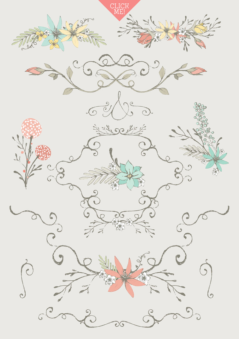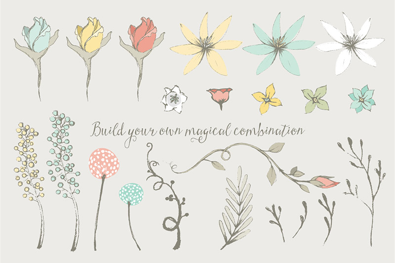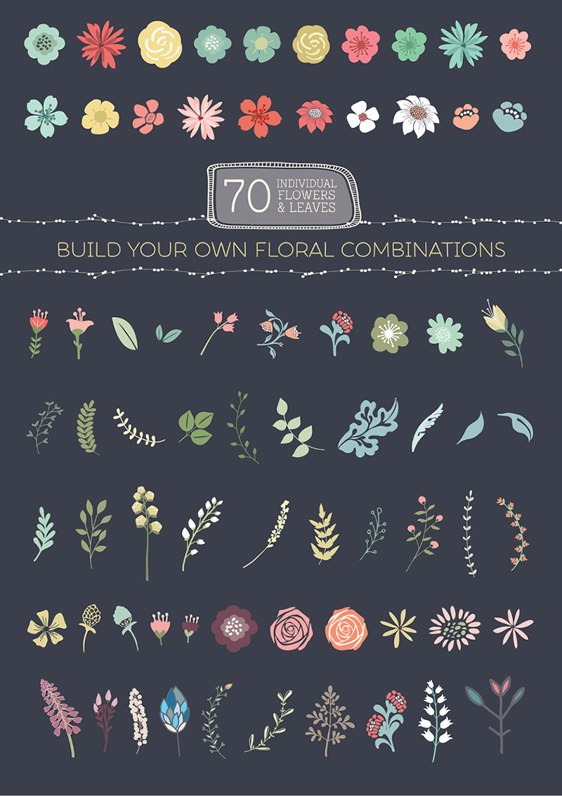 Excellent for Invitations, Save the date, stationery, logos, cards, brochure design, posters and more! With 160 elements to choose from, those creative juices will be flowing in no time 🙂 I love drawing flowers and creating floral combinations, I hope to inspire you with these combos, or make it super-easy for you to build your own combinations with the separate elements included in this pack.
