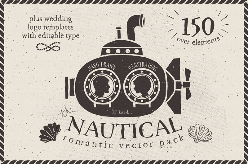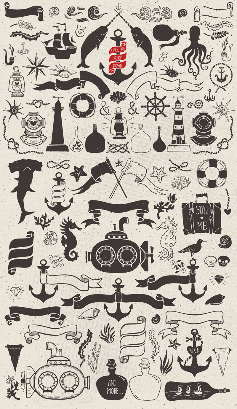 You are in the right place if you are looking for some stuff for projects, popular at all times, nautical style. In this package you will find more than 150 unique hand-drawing graphics. I made this set with a slight slope in the romantic style, so you have the opportunity to make a more unique and personalized designs. Also added are fairly rare things, like an old suit diver, submarine, hammerhead shark, profiles of guys and girls and narwhal for the most original projects.