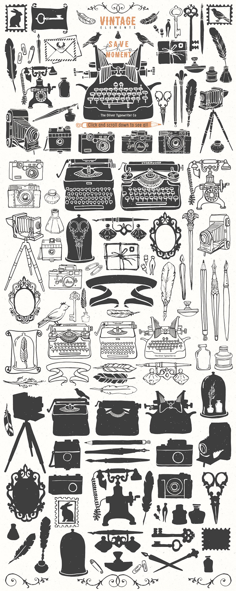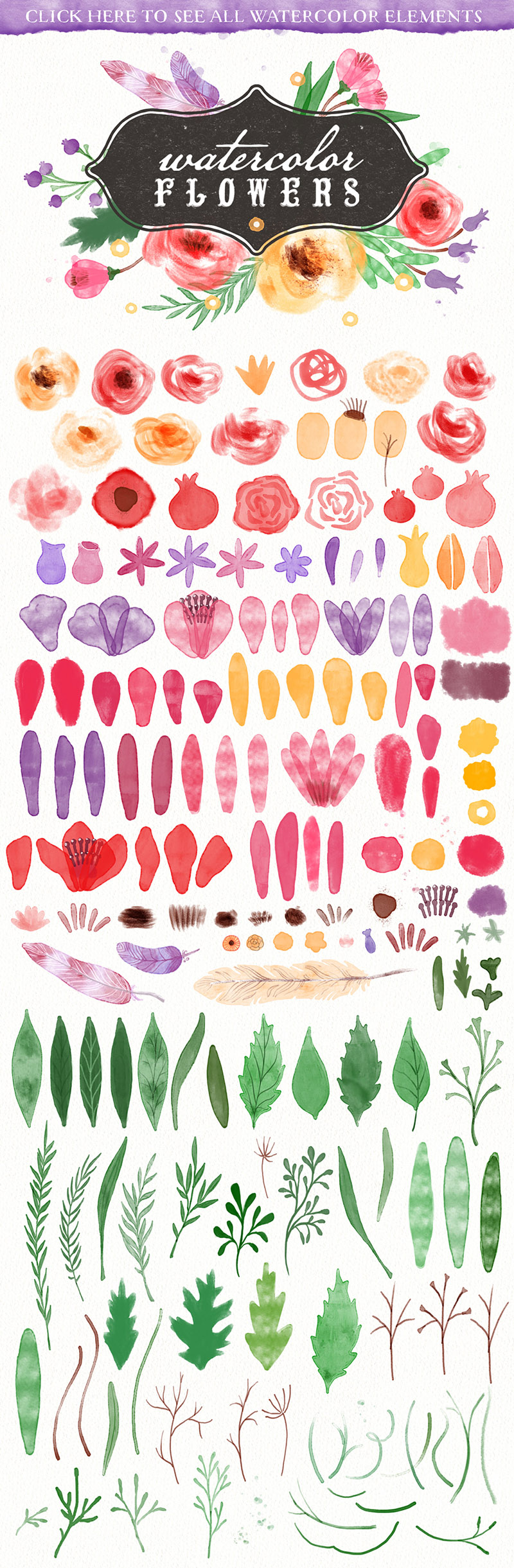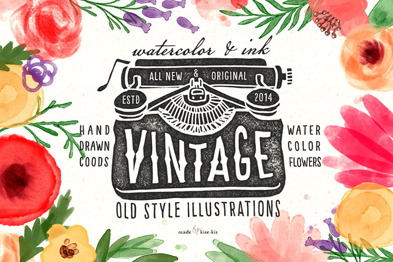 Inspired by some of the old things and the transparency of watercolors, I decided to make a package that combines the elements of graphic ink and watercolor. I think this combination can make your projects really unique. All vintage items were drawn by hand, carefully scanned and converted to vector format for easy editing, change size and color. Each element is represented in several forms with varying degrees of detail to be able to quickly and easily apply the elements in projects of different directions. It was quite difficult to choose those things that should draw for this pack, I stopped on the things that are close to any creative person, designer, artist, photographer and writer. But if you are missing any object, you can always email me and I will include new elements in this, or perhaps in the next package:) Watercolor part consists of a large set of high resolution floral elements, which can be combined in any composition to suit your taste and perfectly complement the vintage ink objects.