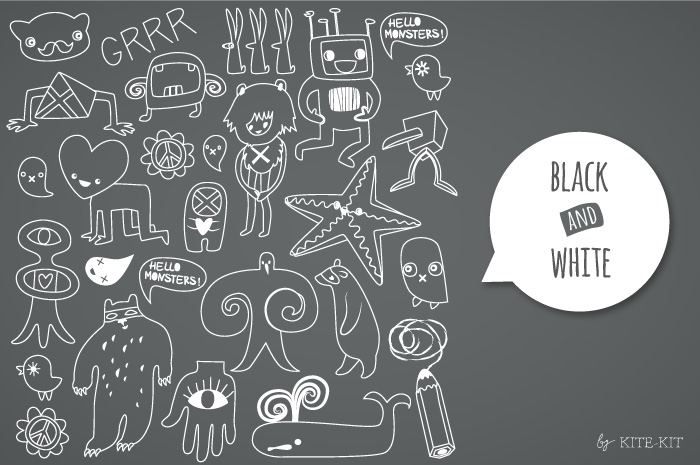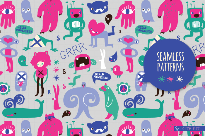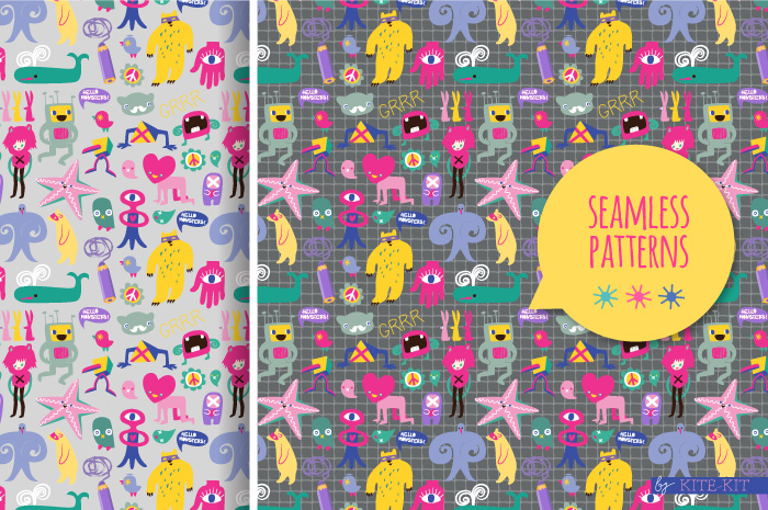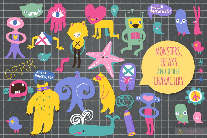 Funny monsters,cute freaks and other characters. In this package you will find 1 file with a set of colored characters and 2 files with sets of contour characters (black and white). Also you get 5 crazy seamless pattern. This digital set perfect for a child’s room design, textile, gift packaging, scrapbooking, personal stationary, and anything your imagination can create:)