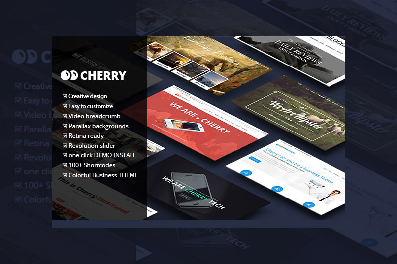 After months of hard work, we are proud to present our latest WordPress Theme, Cherry. It is a unique, multipurpose Theme which enables you to create almost unlimited amount of different and unique page layouts. We prepared *10 unique Skins/Layouts* which demonstrate just how powerful Cherry is. This is possible with a vast combination of page builder blocks and shortcodes. All premade demos are available in our one click demo importer. This means that you will have any layout up and ready in less then 5 minutes. PLEASE NOTE THAT YOU GET ALL 10 DEMOS IN ONE THEME (with one click demo importer for a fast installation).