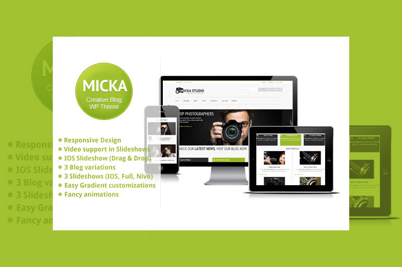 Micka is a responsive WordPress Theme that is perfect for your personal or corporate website. Theme utilizes a unique and premium drag & drop IOS Slideshow which can be seen on the front page. Micka has a convenient Administration panel which provides tons of options to manage and modify any aspect of the theme – it is well suited for both beginners with no coding knowledge and developers. The Theme comes with a plethora of options so you can modify layout, styling, colors and fonts directly from within the backend of your WordPress Theme. You can choose any color you want to be the Theme’s leading color (you can see 8 examples in our preview). The theme allows you to change all the main colors of the Theme (background color for titles, color of title fonts, color of hover elements, color of shadow used on text) along with the background. This means that you can change all the colors and looks of the theme with just a few clicks. Three different blog pages will give you the opportunity to choose the style that you prefer. You can choose from a standard blog, a minimalistic blog and a blog designed to look like portfolio. Four premade home pages will allow you to present your site in a way suited for your company. Choose between a great full width slideshow, nivo slideshow or classical layout with portfolio and recent posts.
