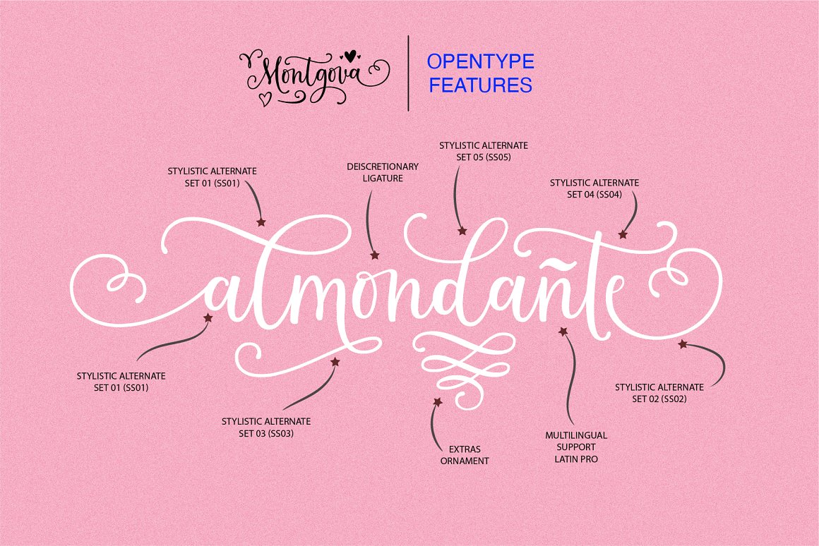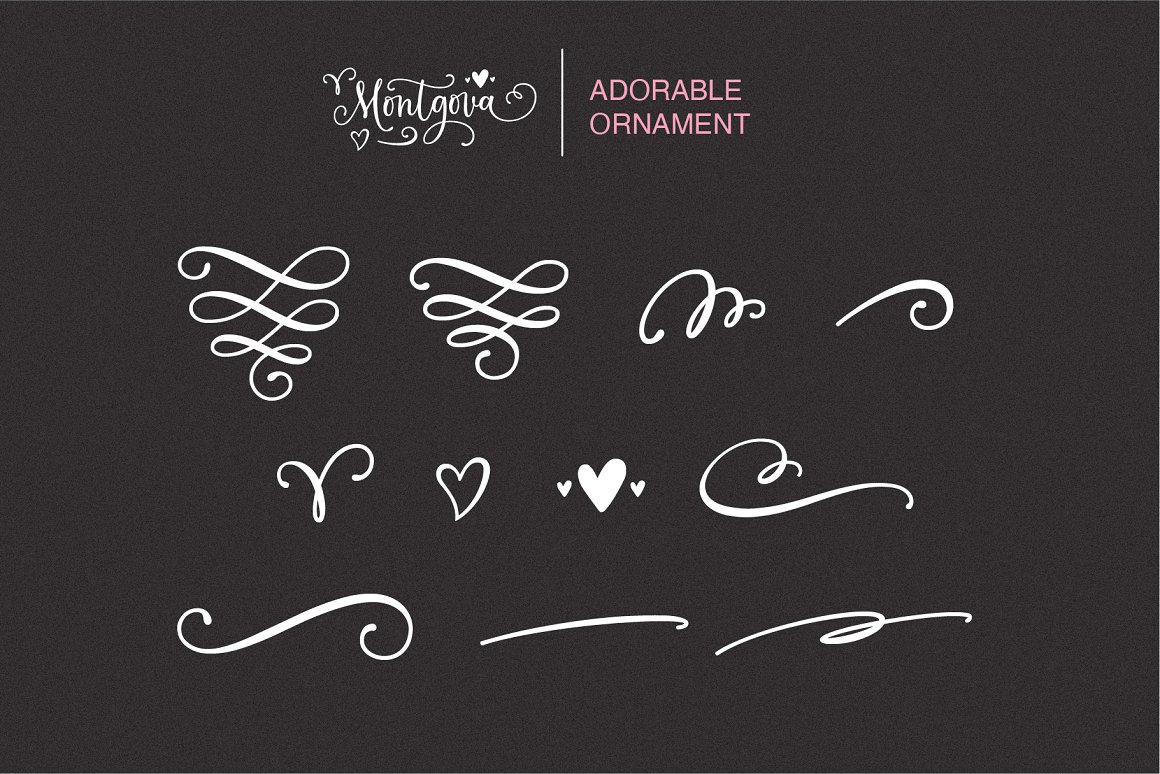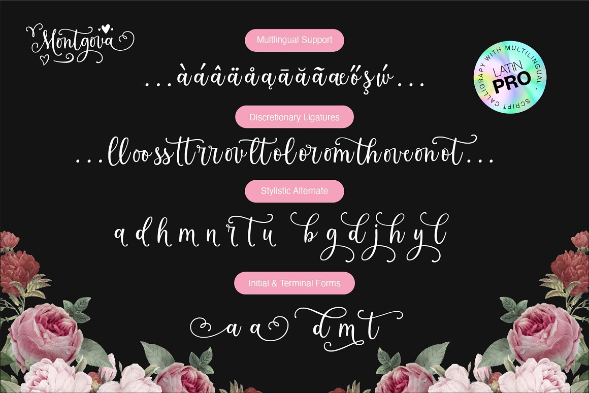 Say hello to Montgova Script! a lovely elegant calligraphy with adorable ornaments. more than 120 included Opentype Stylish Alternate letters and ligatures, allow you to mould your type design any way you like:) It also includes a fancy little bonus ornaments font. A delicate modern calligraphy script ideal for weddings, elegant branding like greeting cards, sublimation, wedding invitation, branding materials, business cards, quotes, posters, aheadings, signature, logos, t-shirt, letterhead, signage, lable, news, posters, badges and adding a lovely feel to your projects. This font is equipped with Latin pro. which covers various languages in the world with a wider range and can be used easily.