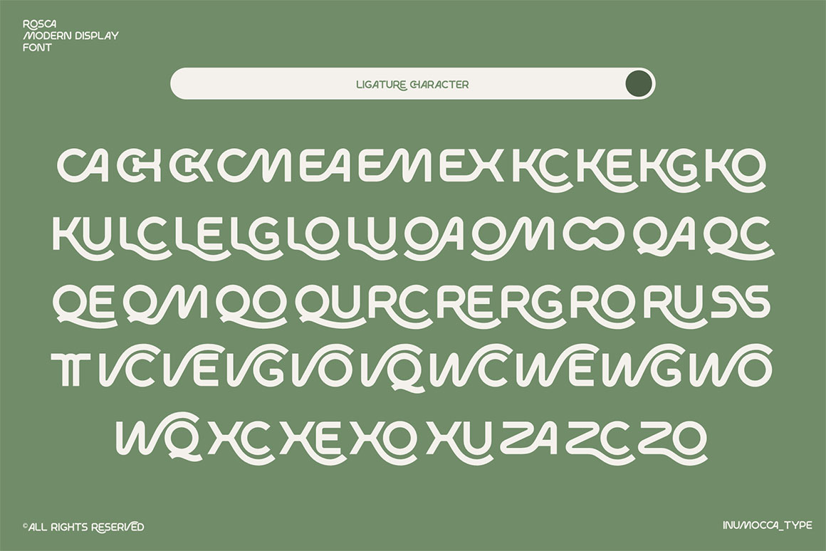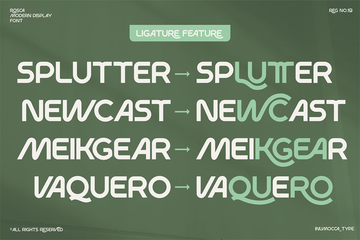 ROSCA Modern Display Font , futuristic and Classy Atmosphere Awesome More Beautiful Ligature and unique Stylistic Alternates. Really playful typeface to covering your Project, like Lettering, Website Interface, Magazine, Branding, Poster, wedding invitations, Quotes Lettering, Logos, and more your project design.