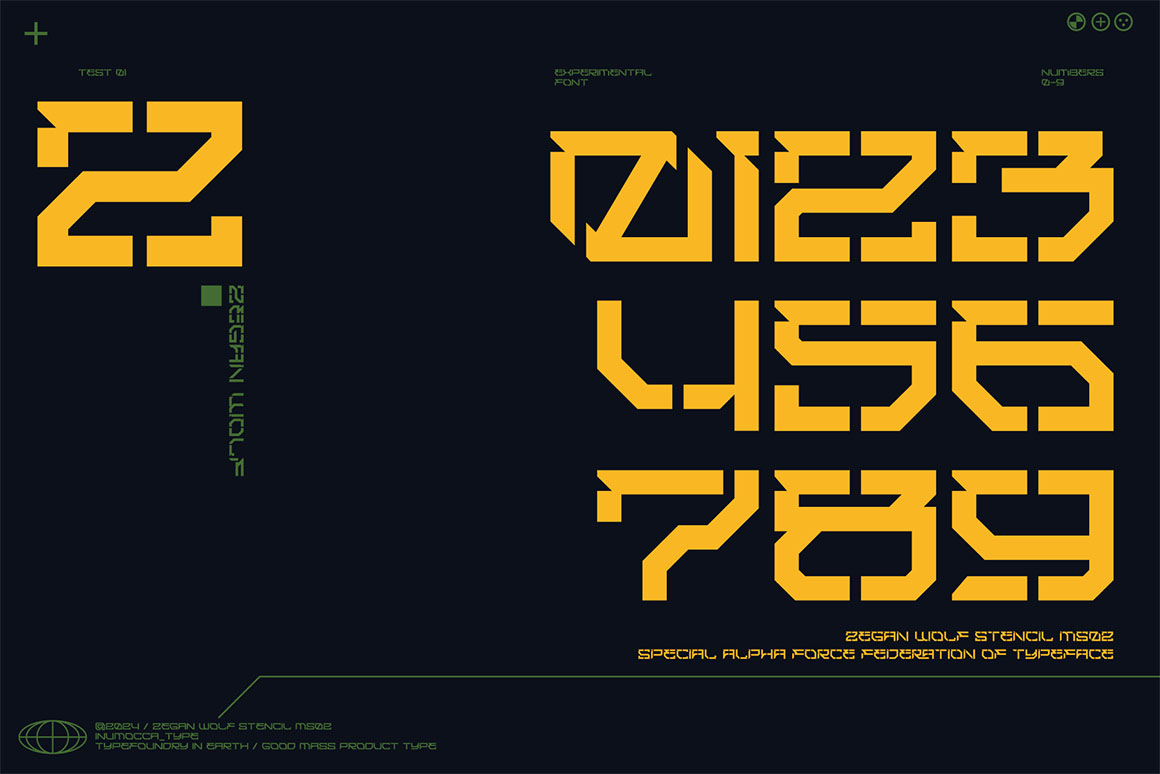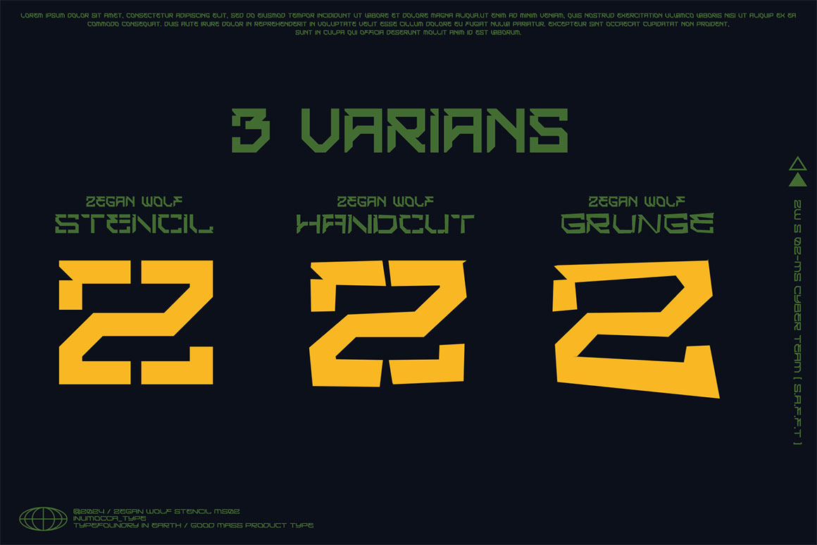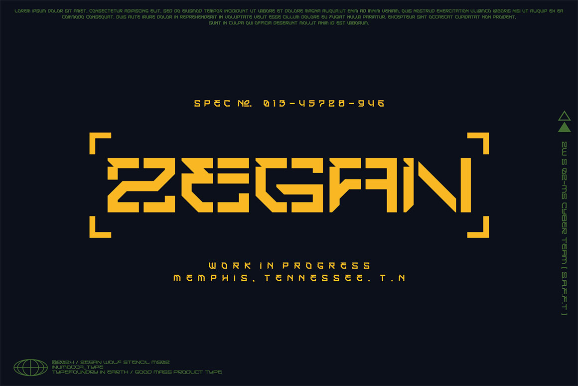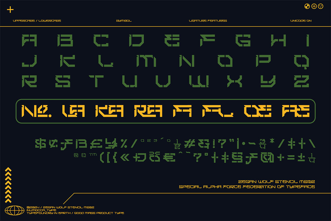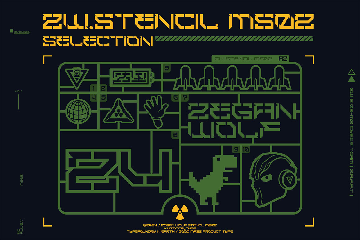 Zegan Wolf STENCIL a Cyber Display Font Inspiration by Game Poster, Military design, Rebel, Modern Technology, Synthwave, Sci-fi Movie Poster, science and Space Theme. Really great font to covering your Project, like poster Game, mecha poster, logotype, Website Interface, Magazine, Branding, Logos, and more your project design.