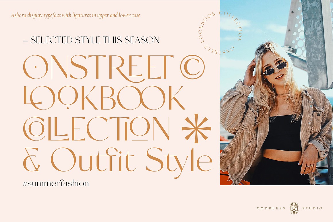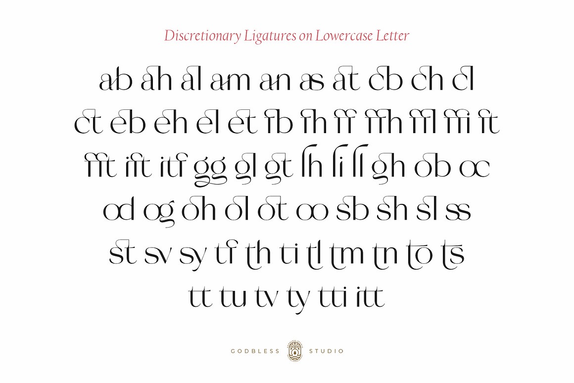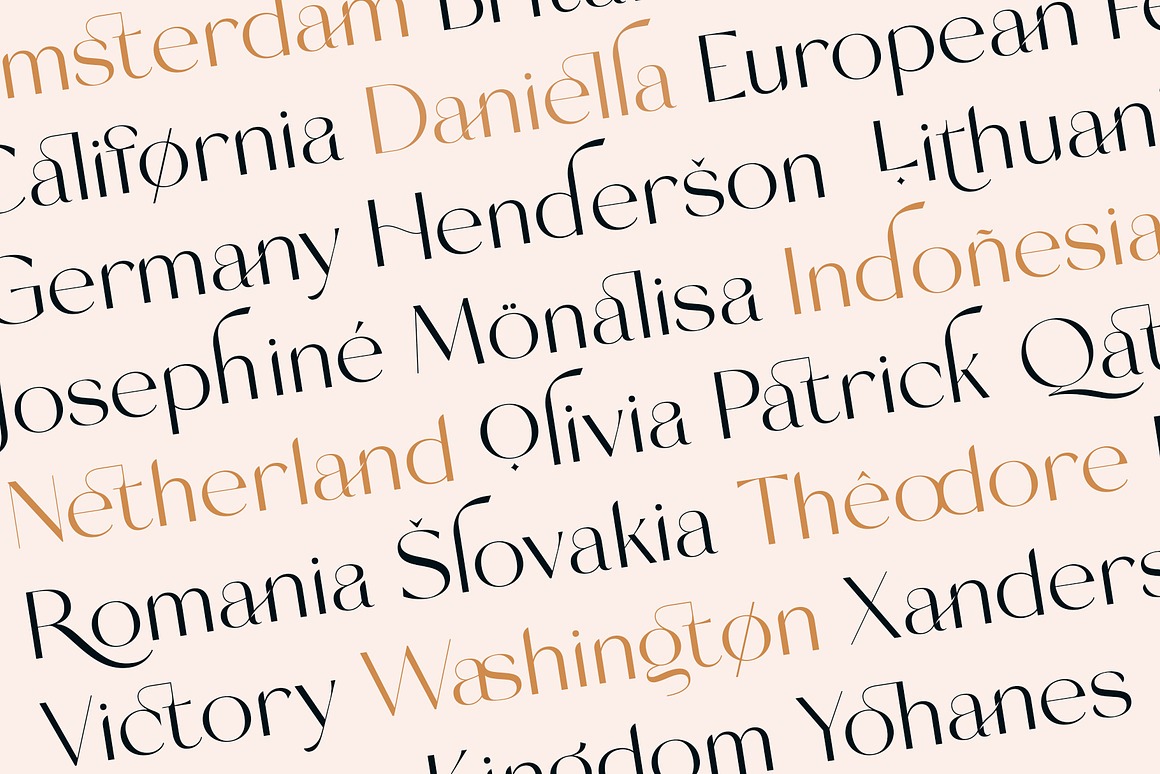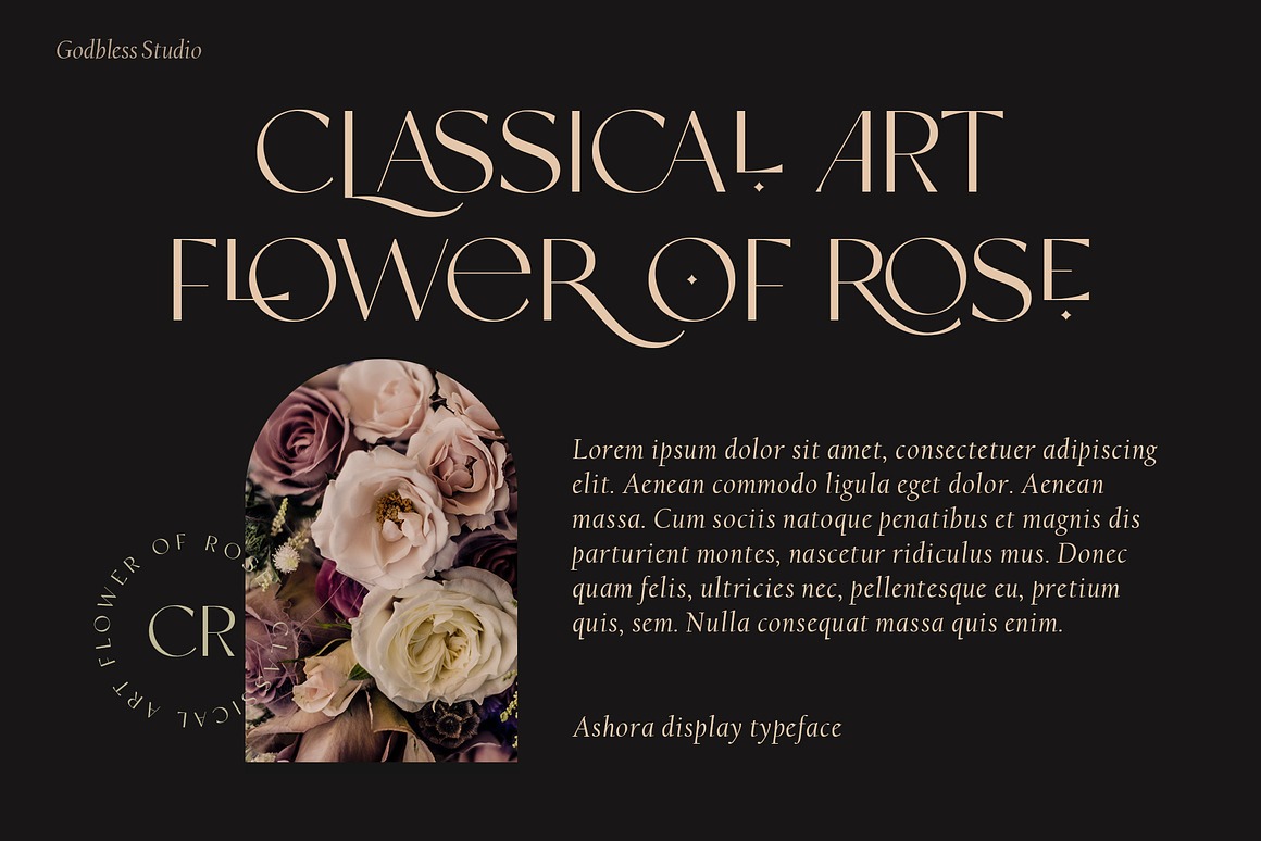 Ashora is an elegant, unique modern display typeface with loads of style font that uses ligatures to smoothly link letters. The large selection of stylistic alternations and ligatures makes this font extremely versatile. Perfect for elegant projects, luxurious branding, wedding invitations, and feminine logo design. Combine this font with other sans serif typefaces for a modern aesthetic.