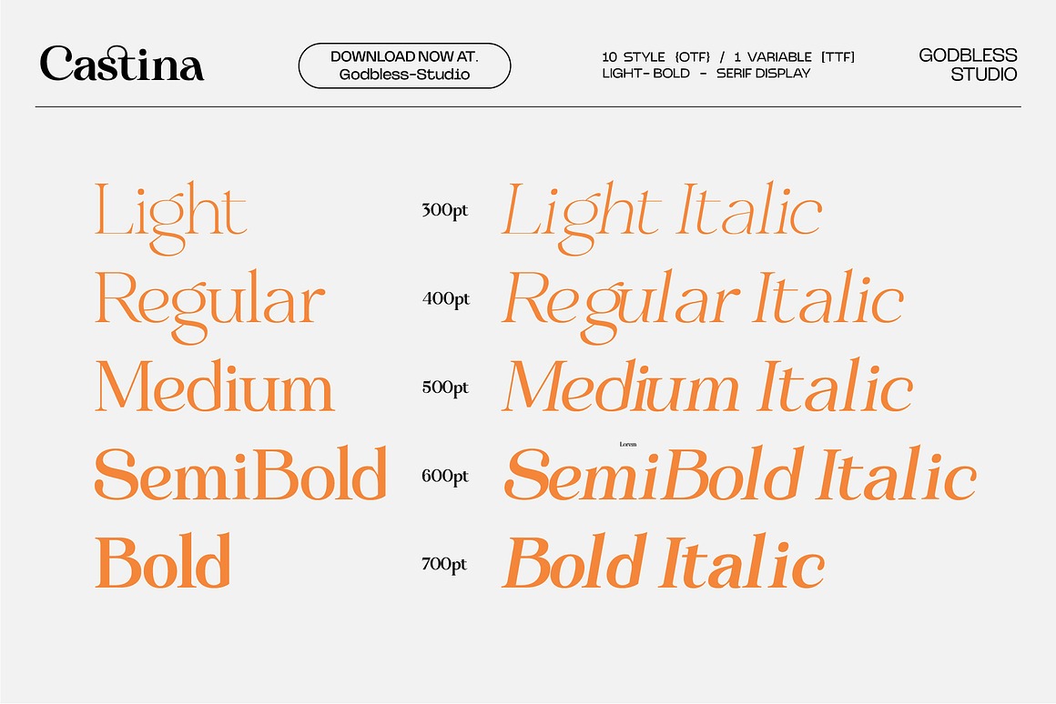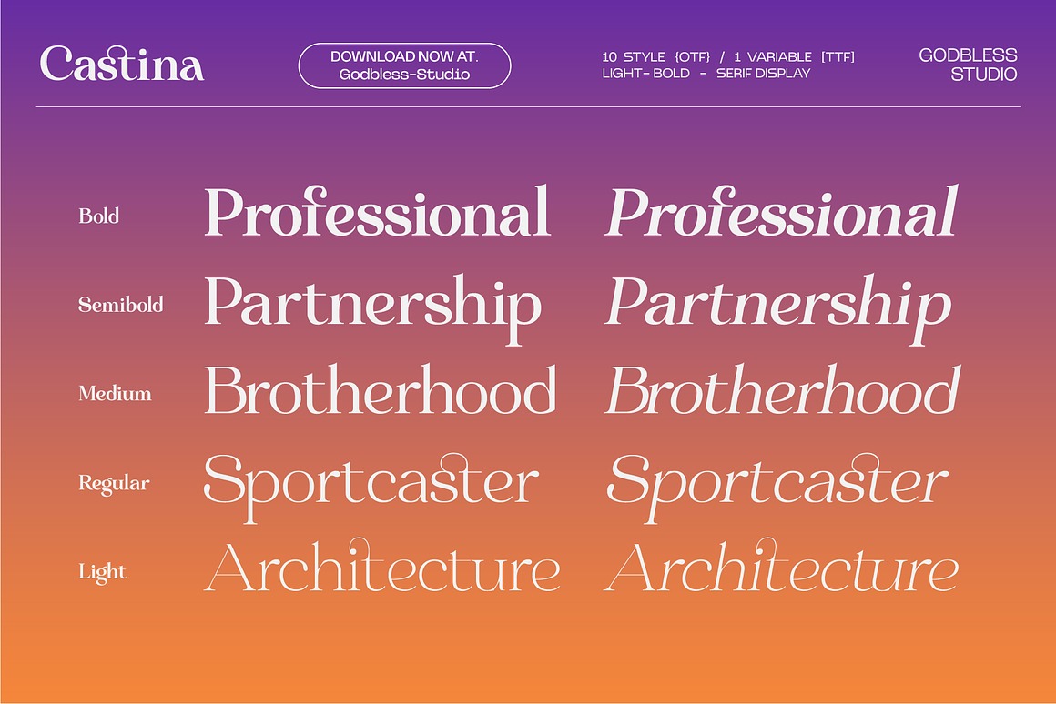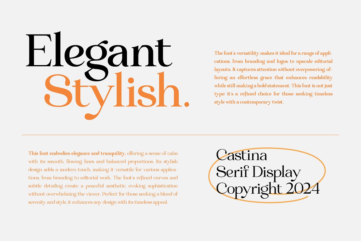 Introducing Castina, a sophisticated serif display font family designed to bring an air of elegance, style, and tranquility to your projects. With a range of five variable weights from Light to Bold, Castina adapts gracefully to any creative application, from editorial layouts to branding, advertising, and print media. Its versatile nature makes it perfect for magazine headlines, luxury packaging, posters, and web design, offering a refined yet approachable aesthetic. Whether you’re aiming for a timeless appeal or a contemporary touch, Castina delivers just the right balance of charm and readability, making it an essential choice for designers and publishers alike. Why Choose Dignity Grotesk? Distinctive Character: Castina features a refined and stylish design with smooth lines and dynamic shapes. Its modern yet timeless appearance makes it ideal for creating memorable and professional visual identities. Versatile Application: Whether you’re working on branding, logo creation, magazine layouts, posters, book covers, or sublimation projects, Castina adapts seamlessly to all these contexts. Its flexibility ensures it fits perfectly into any design scheme. Wide Compatibility: Castina is fully compatible with leading design software including Adobe Photoshop, Adobe Illustrator, CorelDRAW, and more. Integrate it effortlessly into your workflow and watch your creativity come to life. User-Friendly Design: Designed for ease of use, Castina offers various styles and weights, allowing you to select the perfect option for every project. Its intuitive design process enhances your overall experience. Enhance Your Designs: With Castina, every project exudes professionalism and elegance. This font is designed to strengthen your visual message and deliver impressive results. Don’t Miss Out on Elevating Your Design Projects with Castina! Acquire this font today and transform your creative vision into stunning reality. With Castina, sophistication and versatility are at your fingertips, ready to bring your designs to the next level. Get Castina now and experience the art of exceptional design!