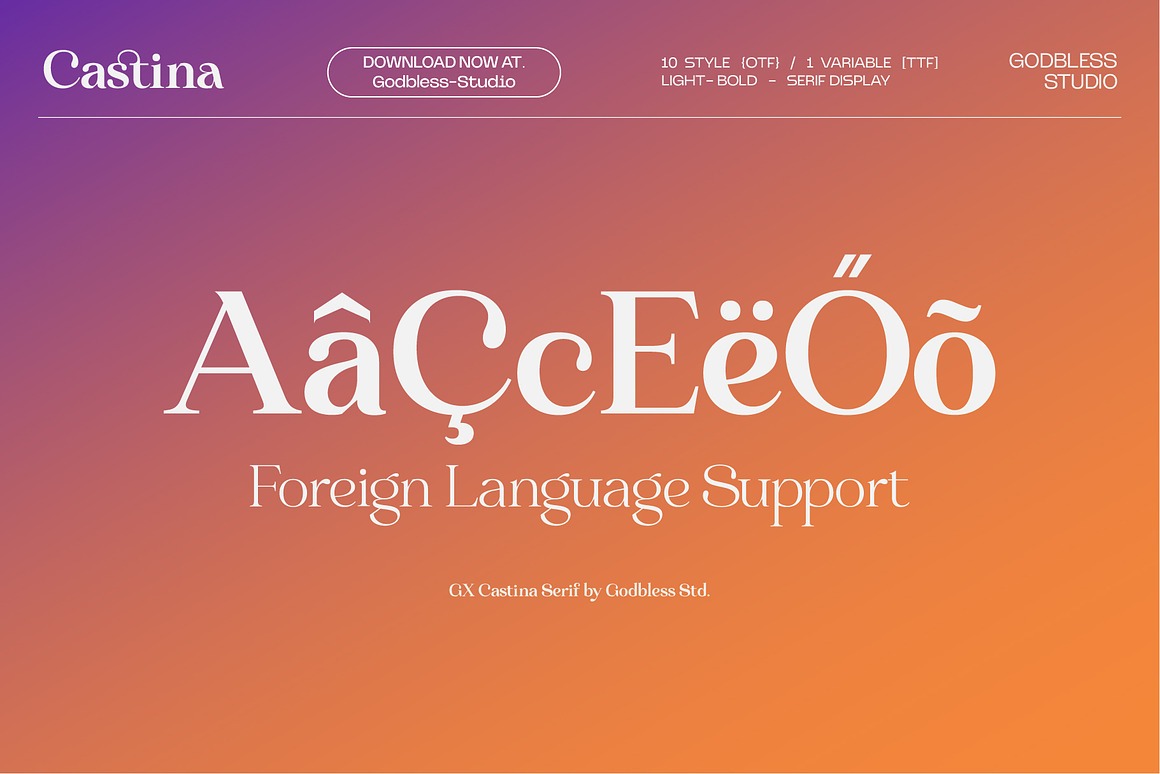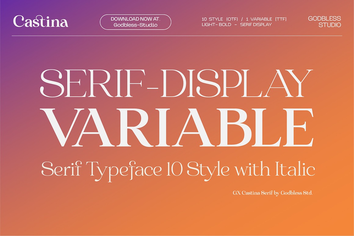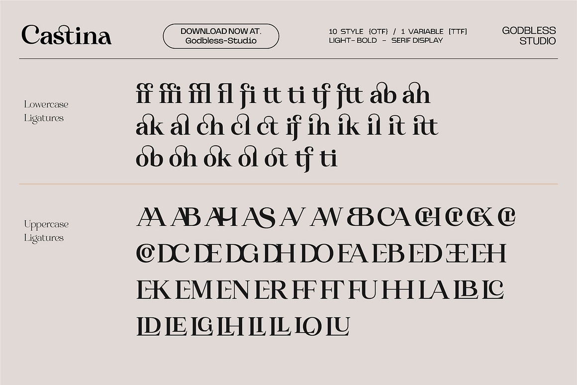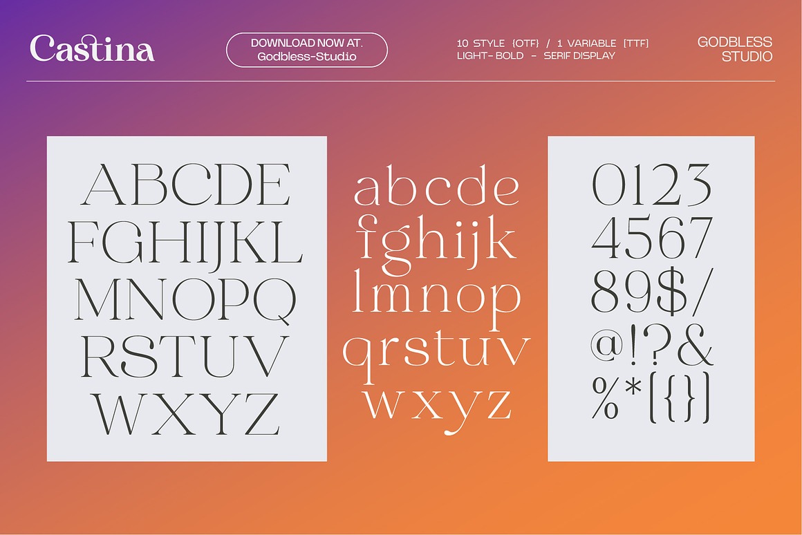 Introducing Castina, a sophisticated serif display font family designed to bring an air of elegance, style, and tranquility to your projects. With a range of five variable weights from Light to Bold, Castina adapts gracefully to any creative application, from editorial layouts to branding, advertising, and print media. Its versatile nature makes it perfect for magazine headlines, luxury packaging, posters, and web design, offering a refined yet approachable aesthetic. Whether you’re aiming for a timeless appeal or a contemporary touch, Castina delivers just the right balance of charm and readability, making it an essential choice for designers and publishers alike. Why Choose Dignity Grotesk? Distinctive Character: Castina features a refined and stylish design with smooth lines and dynamic shapes. Its modern yet timeless appearance makes it ideal for creating memorable and professional visual identities. Versatile Application: Whether you’re working on branding, logo creation, magazine layouts, posters, book covers, or sublimation projects, Castina adapts seamlessly to all these contexts. Its flexibility ensures it fits perfectly into any design scheme. Wide Compatibility: Castina is fully compatible with leading design software including Adobe Photoshop, Adobe Illustrator, CorelDRAW, and more. Integrate it effortlessly into your workflow and watch your creativity come to life. User-Friendly Design: Designed for ease of use, Castina offers various styles and weights, allowing you to select the perfect option for every project. Its intuitive design process enhances your overall experience. Enhance Your Designs: With Castina, every project exudes professionalism and elegance. This font is designed to strengthen your visual message and deliver impressive results. Don’t Miss Out on Elevating Your Design Projects with Castina! Acquire this font today and transform your creative vision into stunning reality. With Castina, sophistication and versatility are at your fingertips, ready to bring your designs to the next level. Get Castina now and experience the art of exceptional design!