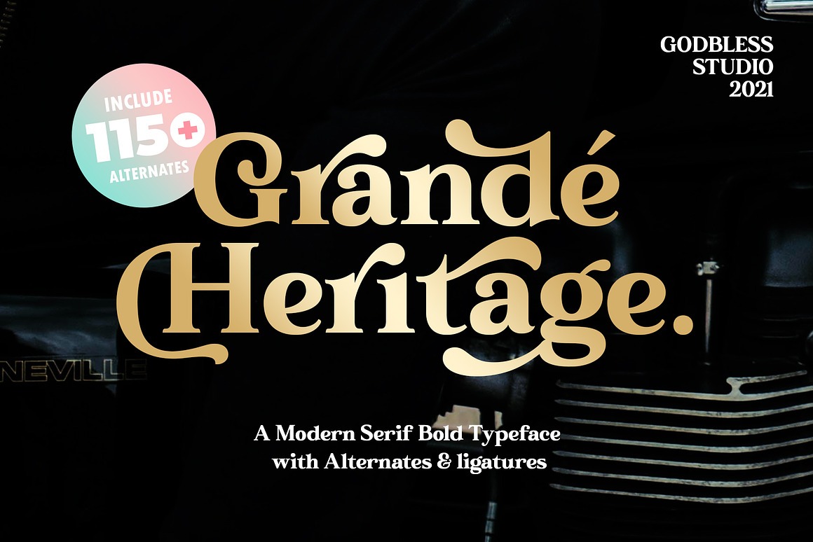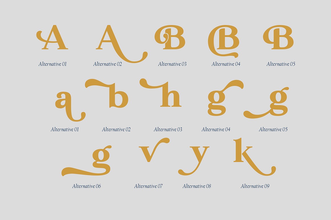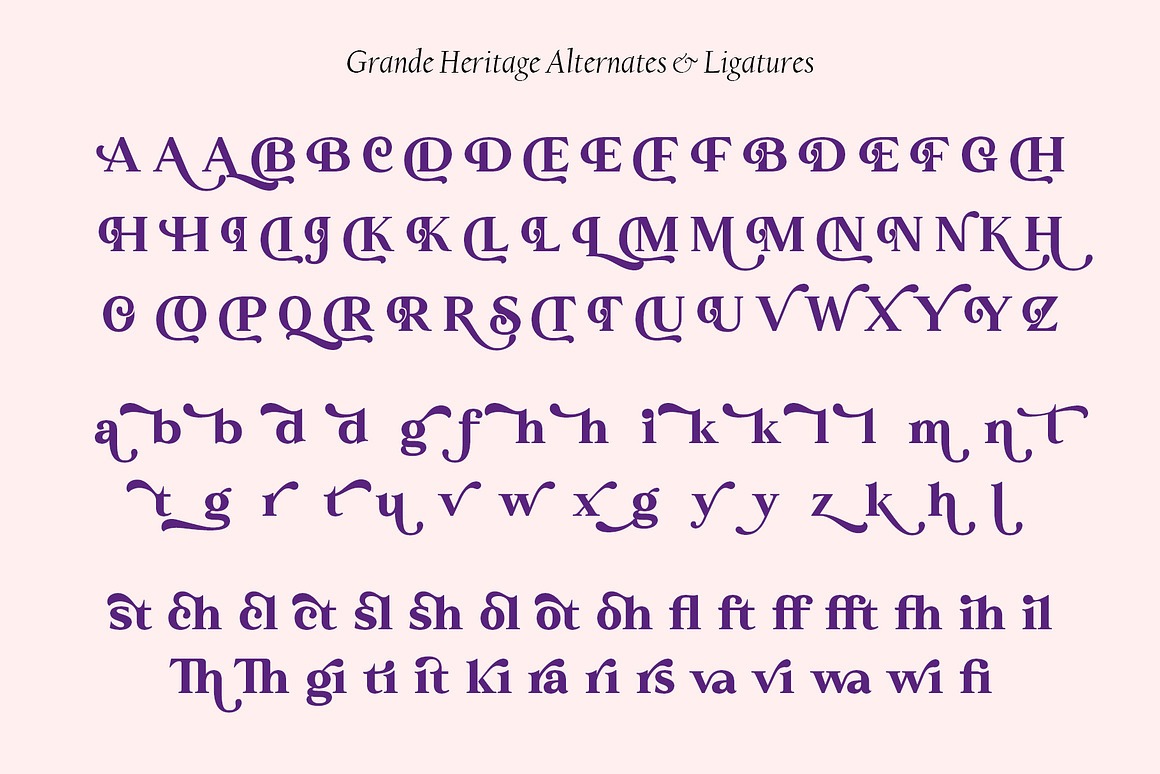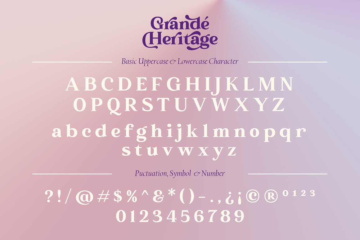 Grande Heritage is a very versatile font, unique modern serif bold typeface with loads of style font that uses ligatures and many alternates. You will get classy, elegant, and certainly unique logos with this font. it is perfect for handling design jobs that cover a wide range of types such as elegant projects, luxurious branding, wedding invitations, poster design and so on. Grande Heritage is also included full set of: Uppercase & Lowercase letters Stylistic Alternates Character Multilingual characters Numerals Punctuation Ligatures Collection.