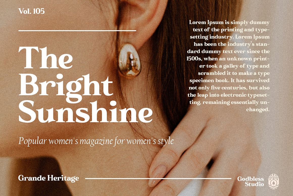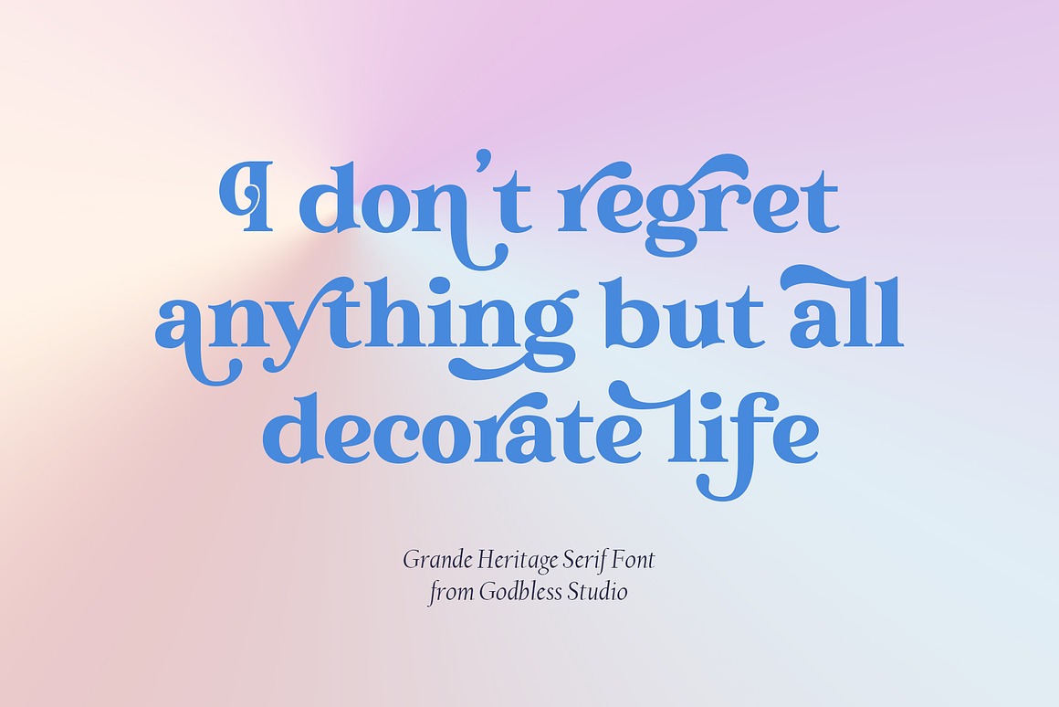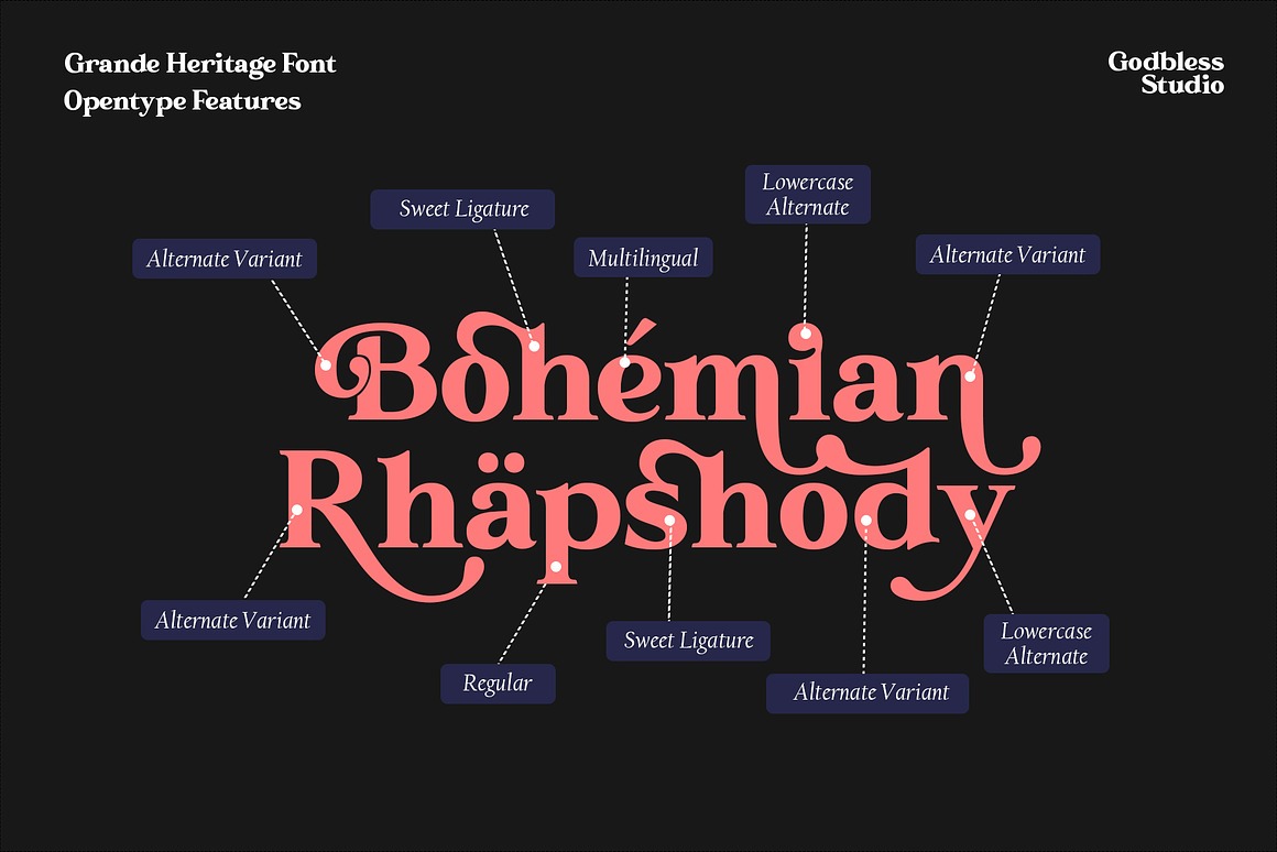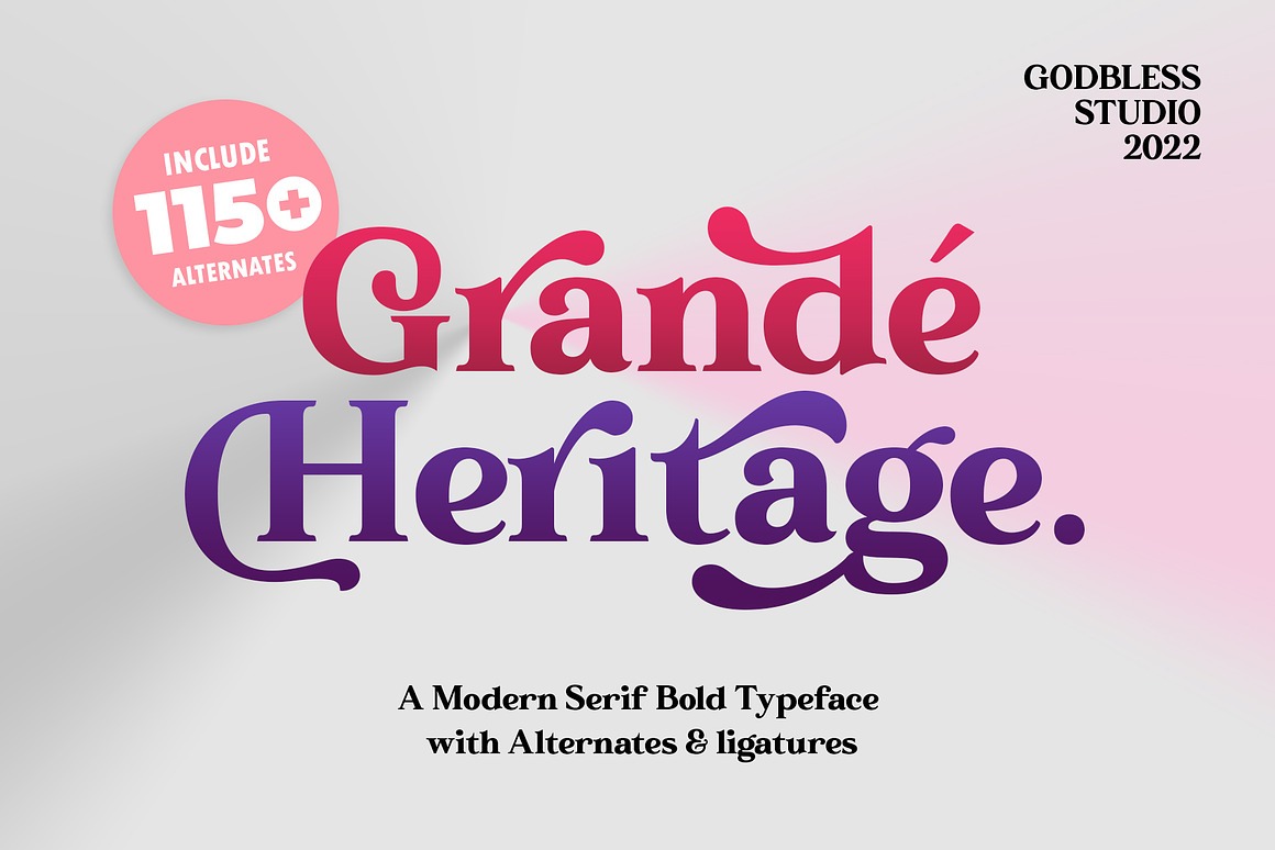 Grande Heritage is a very versatile font, unique modern serif bold typeface with loads of style font that uses ligatures and many alternates. You will get classy, elegant, and certainly unique logos with this font. it is perfect for handling design jobs that cover a wide range of types such as elegant projects, luxurious branding, wedding invitations, poster design and so on. Grande Heritage is also included full set of: Uppercase & Lowercase letters Stylistic Alternates Character Multilingual characters Numerals Punctuation Ligatures Collection.