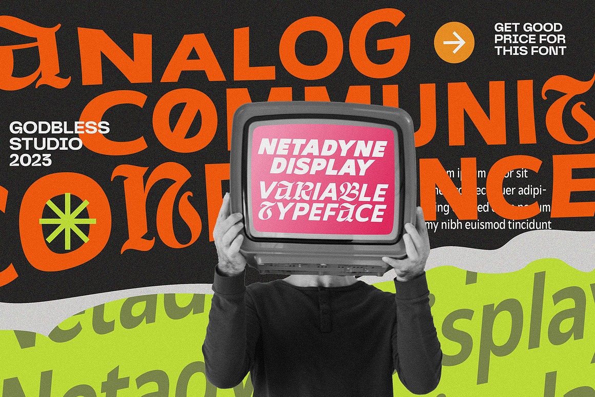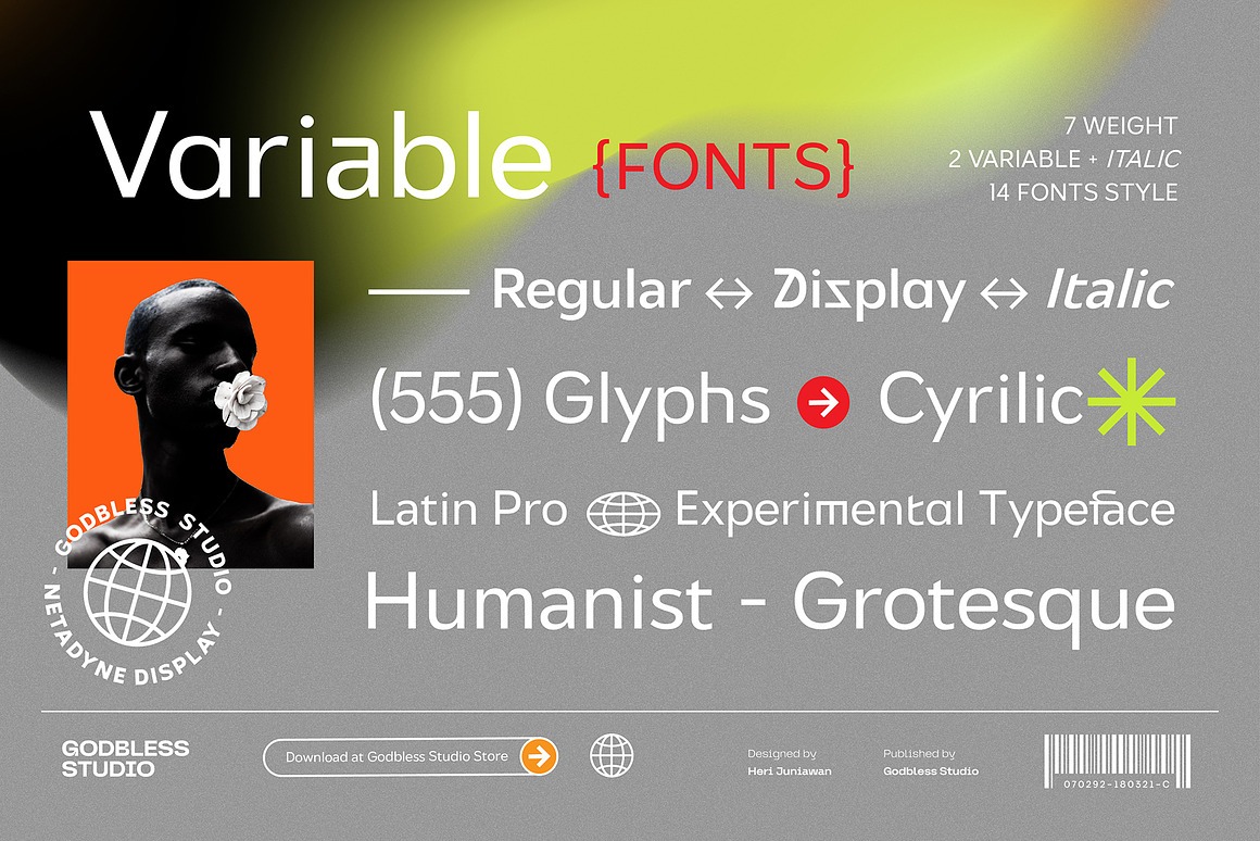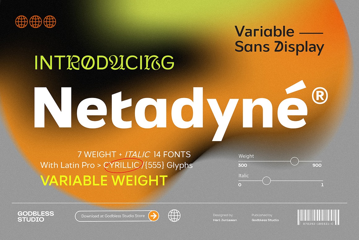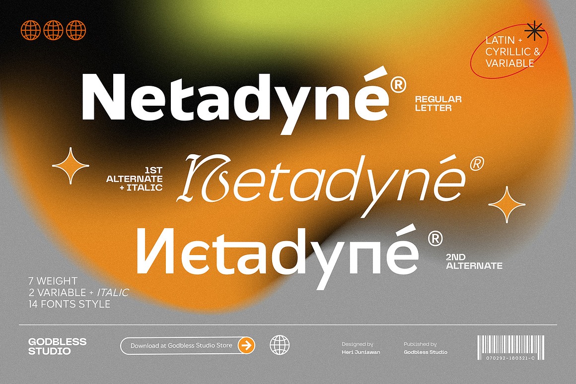 Netadyne was created experimentally following a futuristic style recipe with characters made to keep up with today’s developments and also combined with various unique alternate variations to produce a font with a very charismatic and sturdy concept. Netadyne is a variable font that has 7 weights with 14 fonts from light to black and also includes italic. Netadyne is a versatile font system, designed primarily for display uses with a need of visual impact. Feature : -Uppercase & Lowercase -Alternate Character -Ligature -Discretionary Ligature -Multilingual Support Latin & Cyrillic -Numeral & Punctuation -etc.