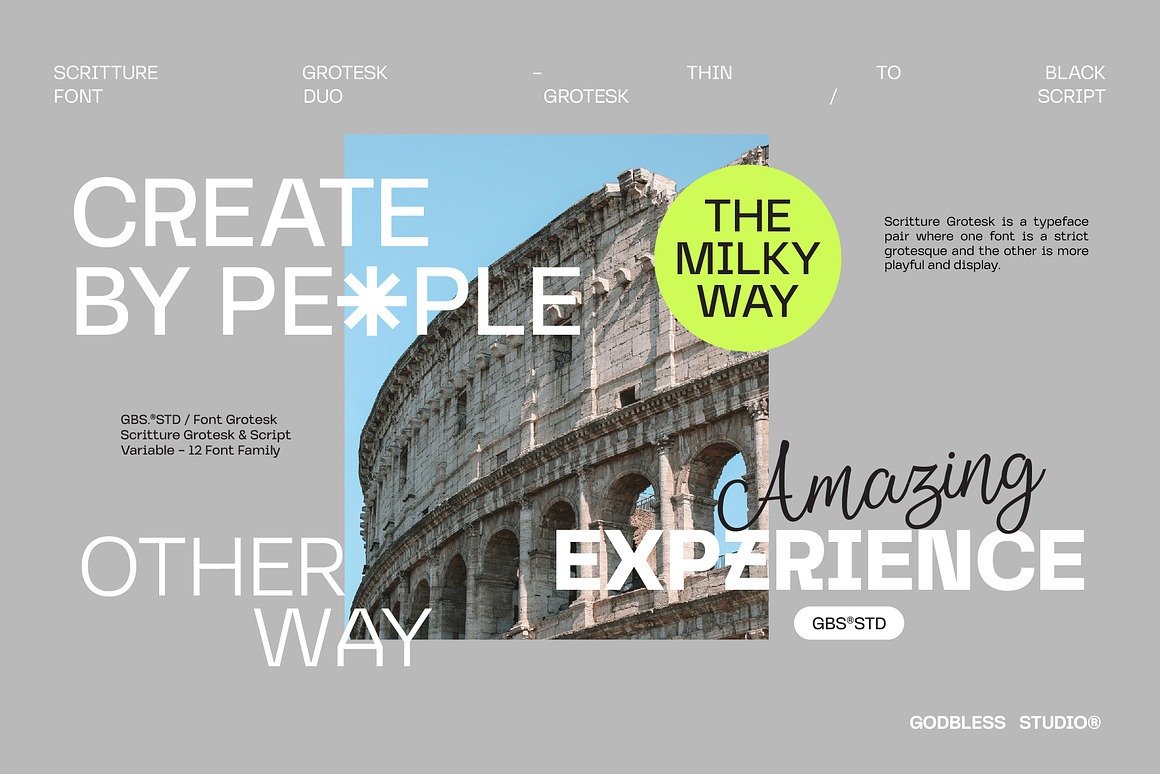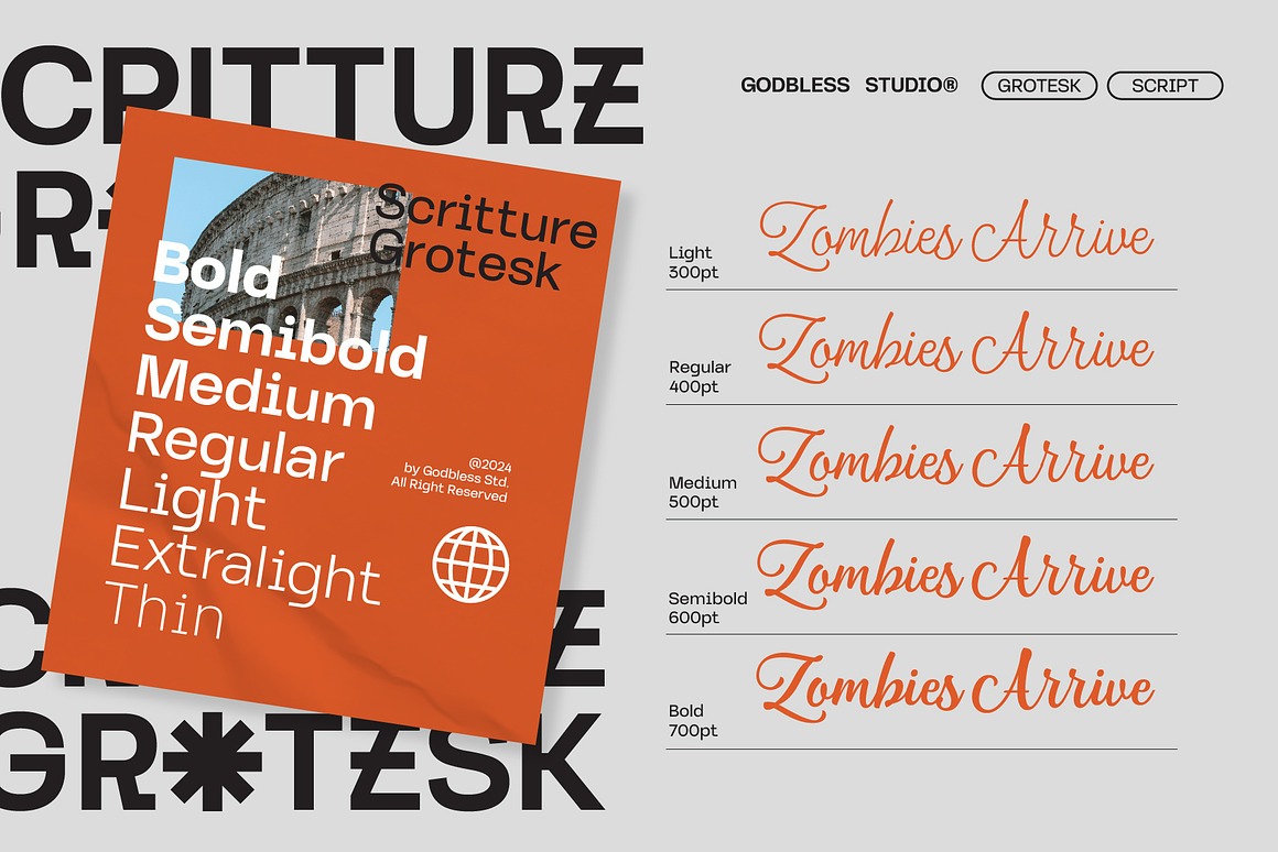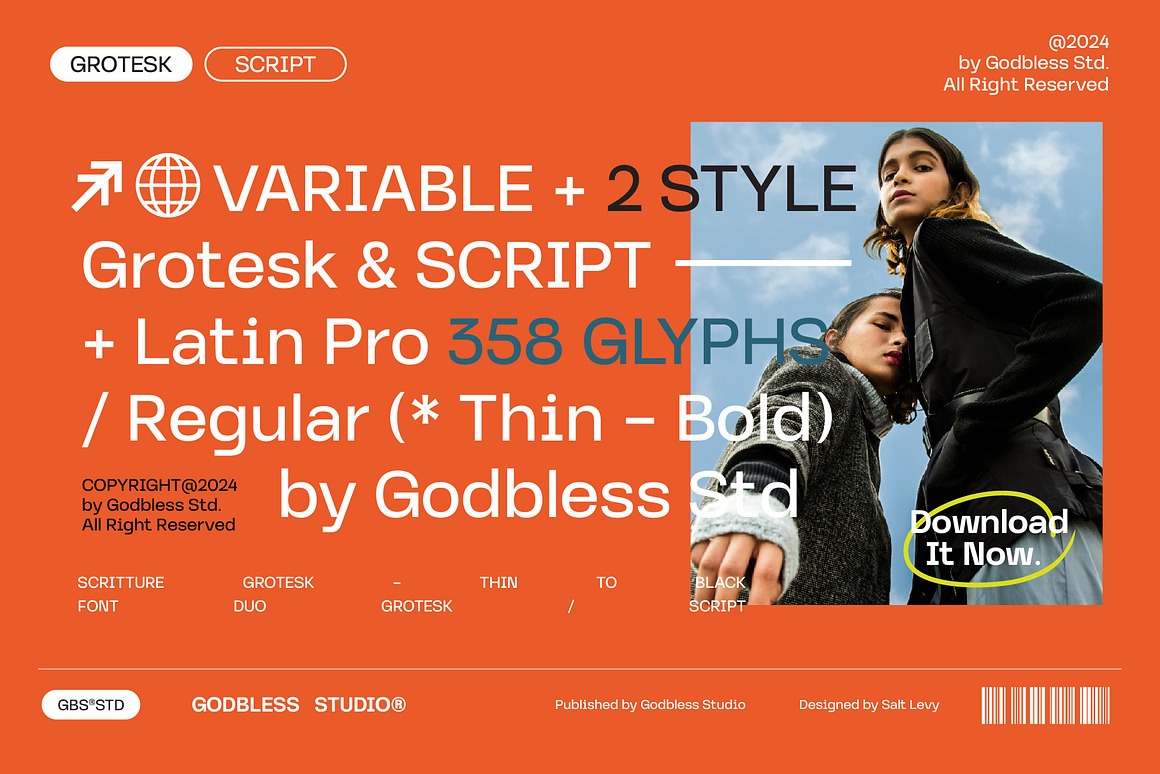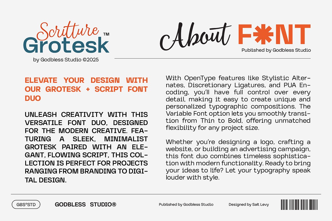 Elevate Your Design with Our Grotesk + Script Font Duo, Scritture Grotesk. Unleash creativity with this versatile font duo, designed for the modern creative. Featuring a sleek, minimalist Grotesk paired with an elegant, flowing Script, this collection is perfect for projects ranging from branding to digital design. With OpenType features like Stylistic Alternates, Discretionary Ligatures, and PUA Encoding, you’ll have full control over every detail, making it easy to create unique and personalized typographic compositions. The Variable Font option lets you smoothly transition from Thin to Bold, offering unmatched flexibility for any project size. Whether you’re designing a logo, crafting a website, or building an advertising campaign, this font duo combines timeless sophistication with modern functionality. Ready to bring your ideas to life? Let your typography speak louder with style.