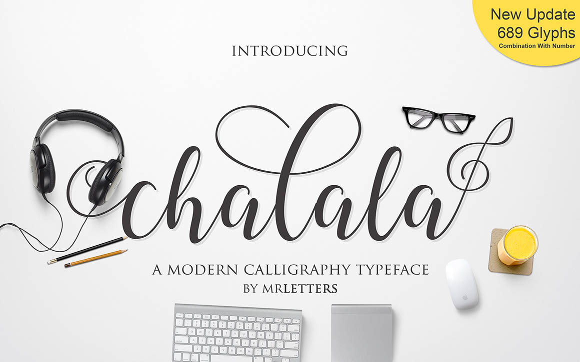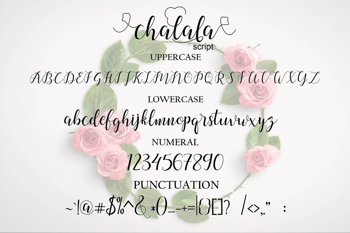 Chalala Script a new fresh & modern script with a handmade calligraphy style, decorative characters and a dancing baseline! So beautiful on invitation like greeting cards, branding materials, business cards, quotes, posters, and more!! Chalala Script come with 656 glyphs. The alternative characters were divided into several Open Type features such as Swash, Stylistic Sets, Stylistic Alternates, Contextual Alternates. The Open Type features can be accessed by using Open Type savvy programs such as Adobe Illustrator, Adobe InDesign, Adobe Photoshop Corel Draw X version, And Microsoft Word. And this Font has given PUA unicode (specially coded fonts). so that all the alternate characters can easily be accessed in full by a craftsman or designer. Chalala Script: Uppercase & Lowercase International Languange & Symbols Support Punctuation & Number PUA Unicode Range Standard Stylistic Alternates Stylistic Set 1-16 Character Variant Contextual.