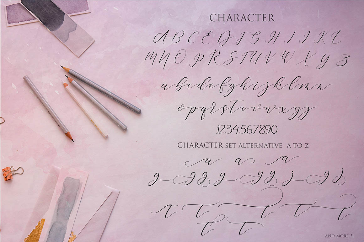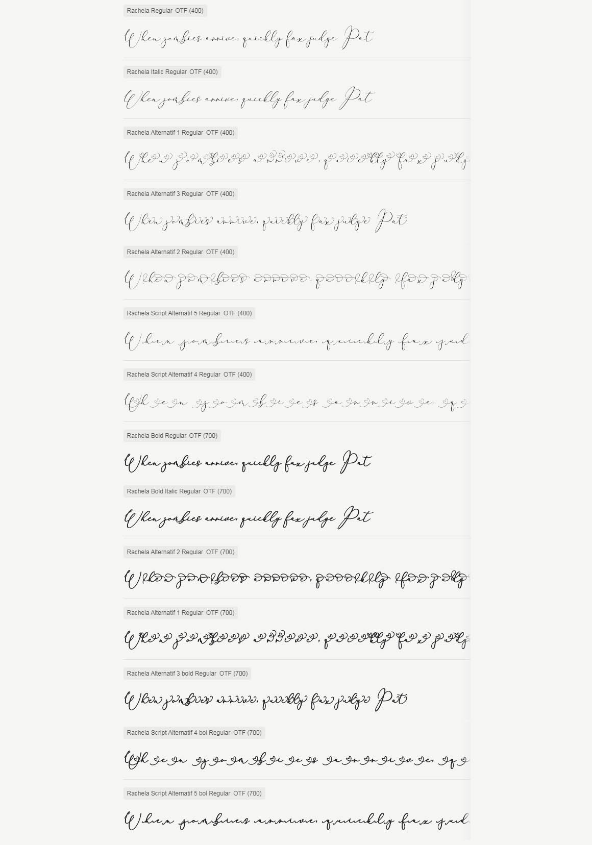 Rachela Lovely Calligraphy A new and beautiful font, created to meet your needs in creating a beautiful and elegant design, this font is special for you. Rachela Lovely Calligraphy Font is perfect for branding, wedding invitations, magazines, mugs, business cards, quotes, posters, and more you can use on your big project would be very beautiful. Rachela Lovely Calligraphy This font has been equipped with OpenType features and has many glyphs. and of course by having many of these glyphs will be able to choose the letters according to your liking, lots of variations and options for each letter, so you can customize your design choices and also have other languages supported.