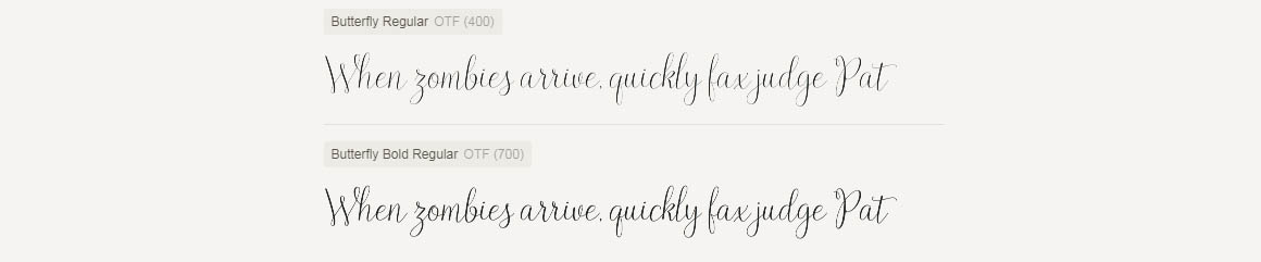 Butterfly Script is modern calligraphy design, including Regular and Bold Script. This font is elegant and pretty with swashes. Can used for various purposes. such as logo, product packaging, wedding invitations, branding, headlines, signage, labels, signature, book covers, posters, quotes and more.