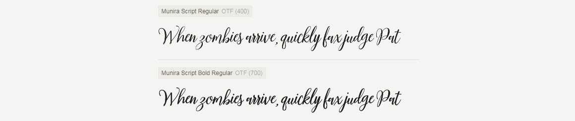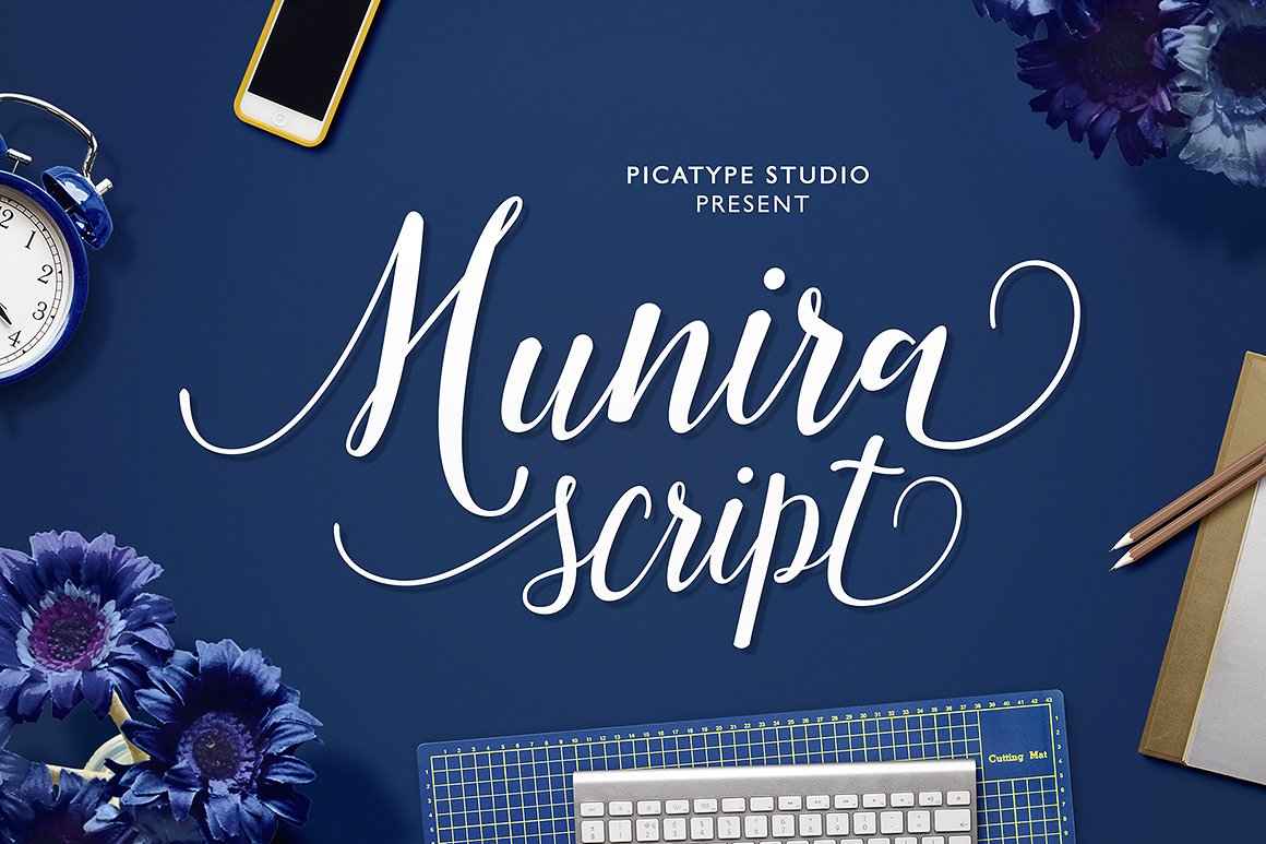 Munira Script is modern calligraphy design, including Regular and Bold Script. This font is casual and pretty with swashes. Can used for various purposes. such as logo, product packaging, wedding invitations, branding, headlines, signage, labels, signature, book covers, posters, quotes and more.